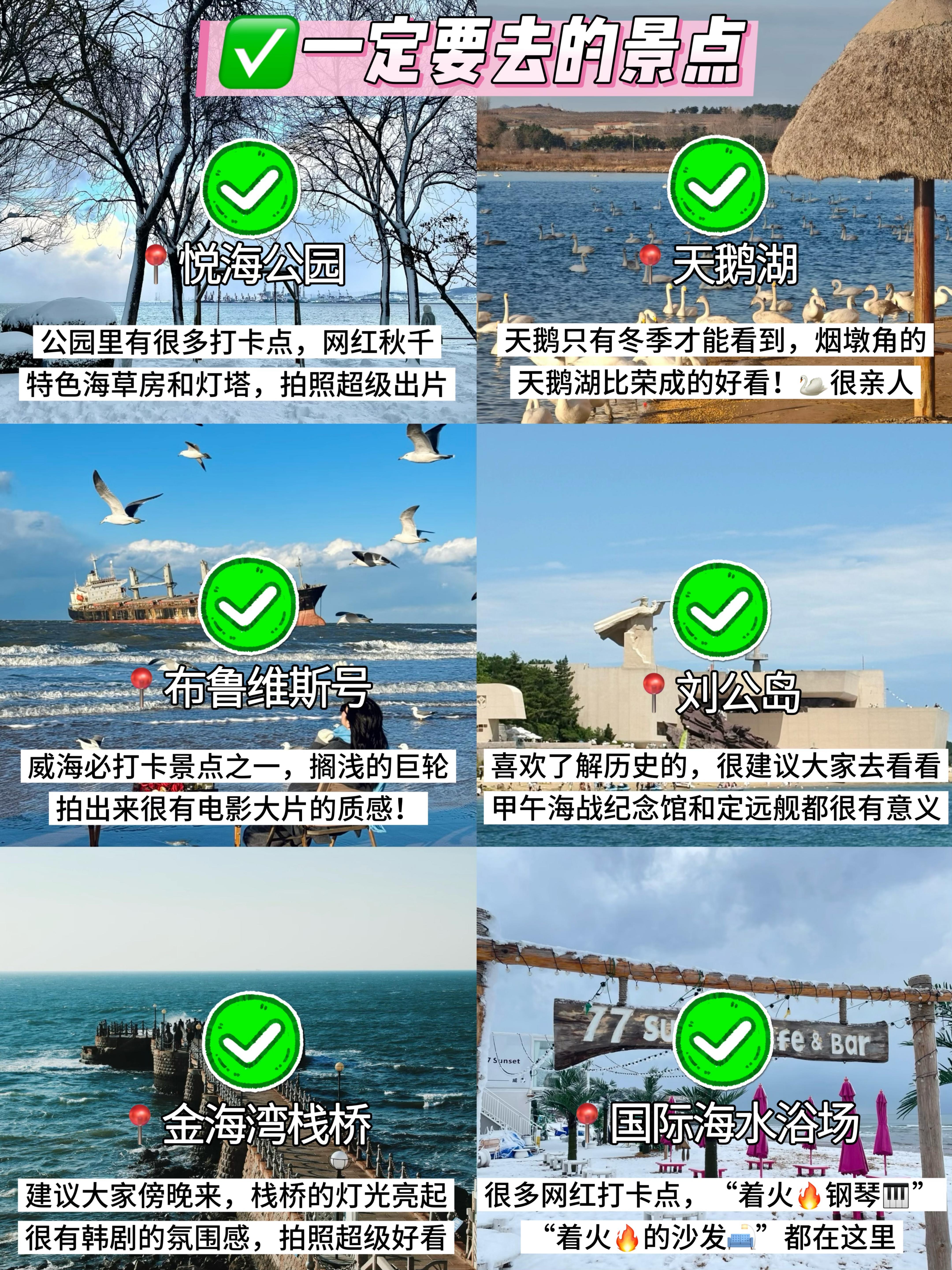 ✅值得打卡的的景点:悦海公园、天鹅湖、布鲁维斯号、刘公岛、金海湾栈桥、国际海水浴场