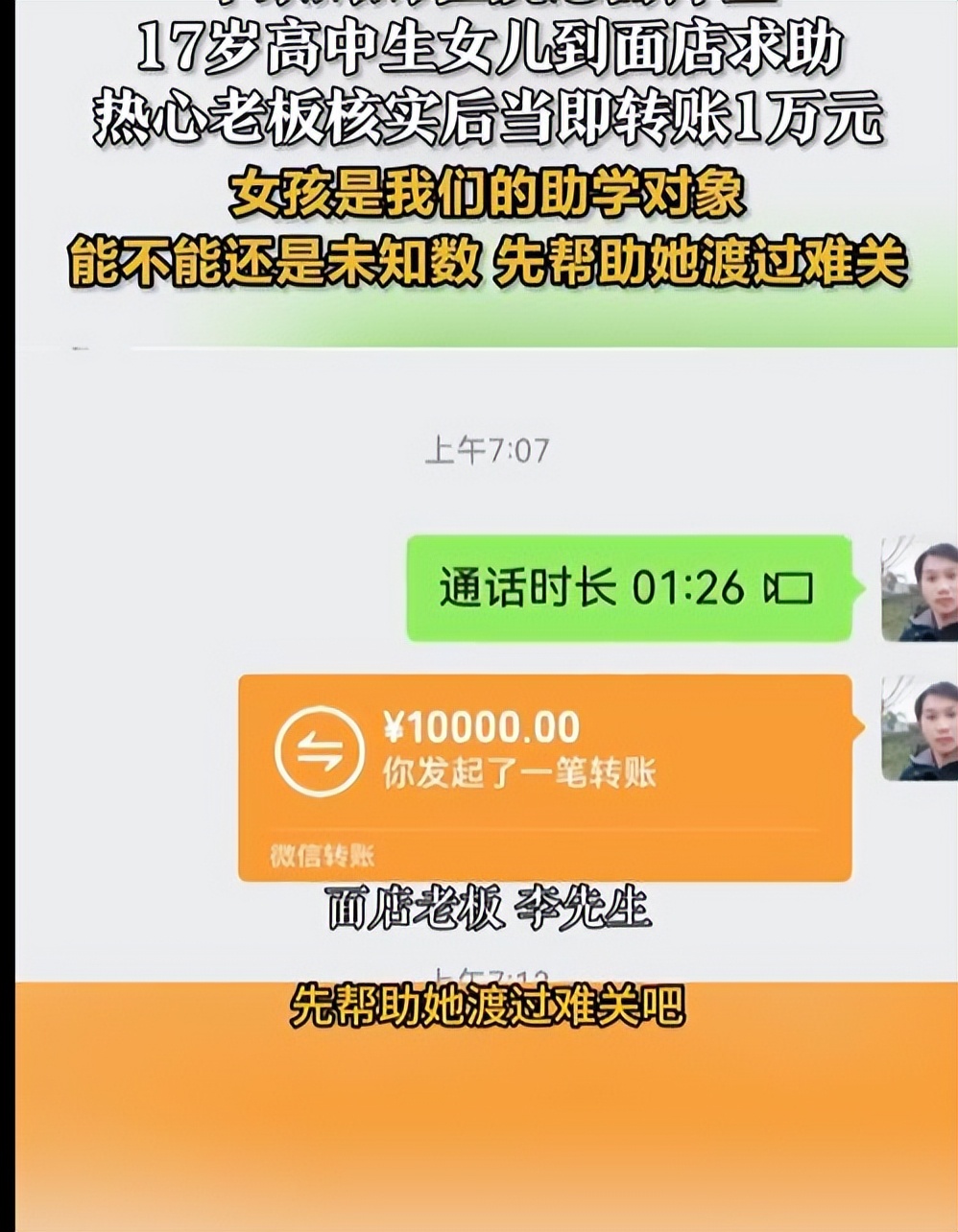 面馆老板虽有些为难,但是还是答应了,他直接加了女生的微信,向她转了1万块钱。