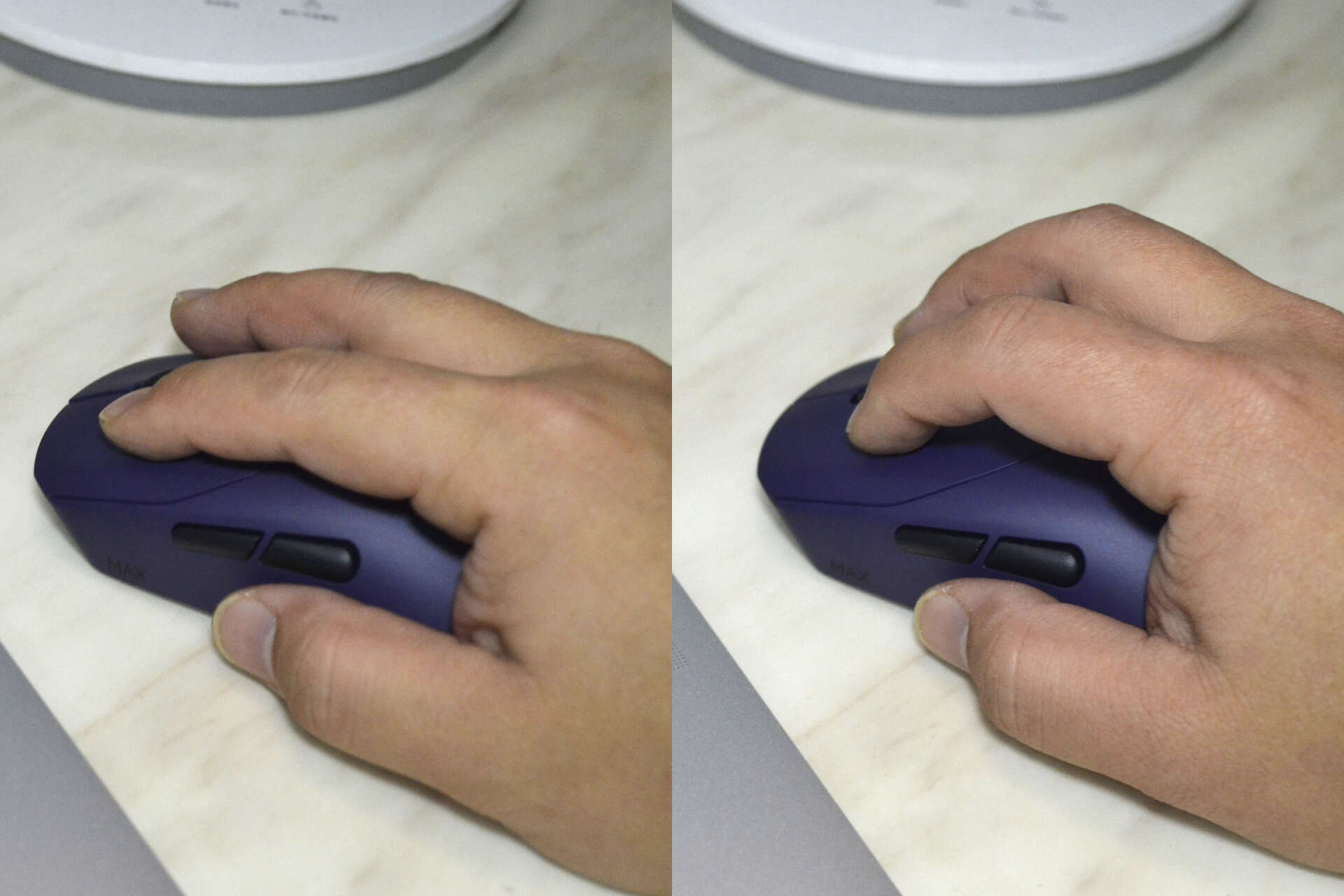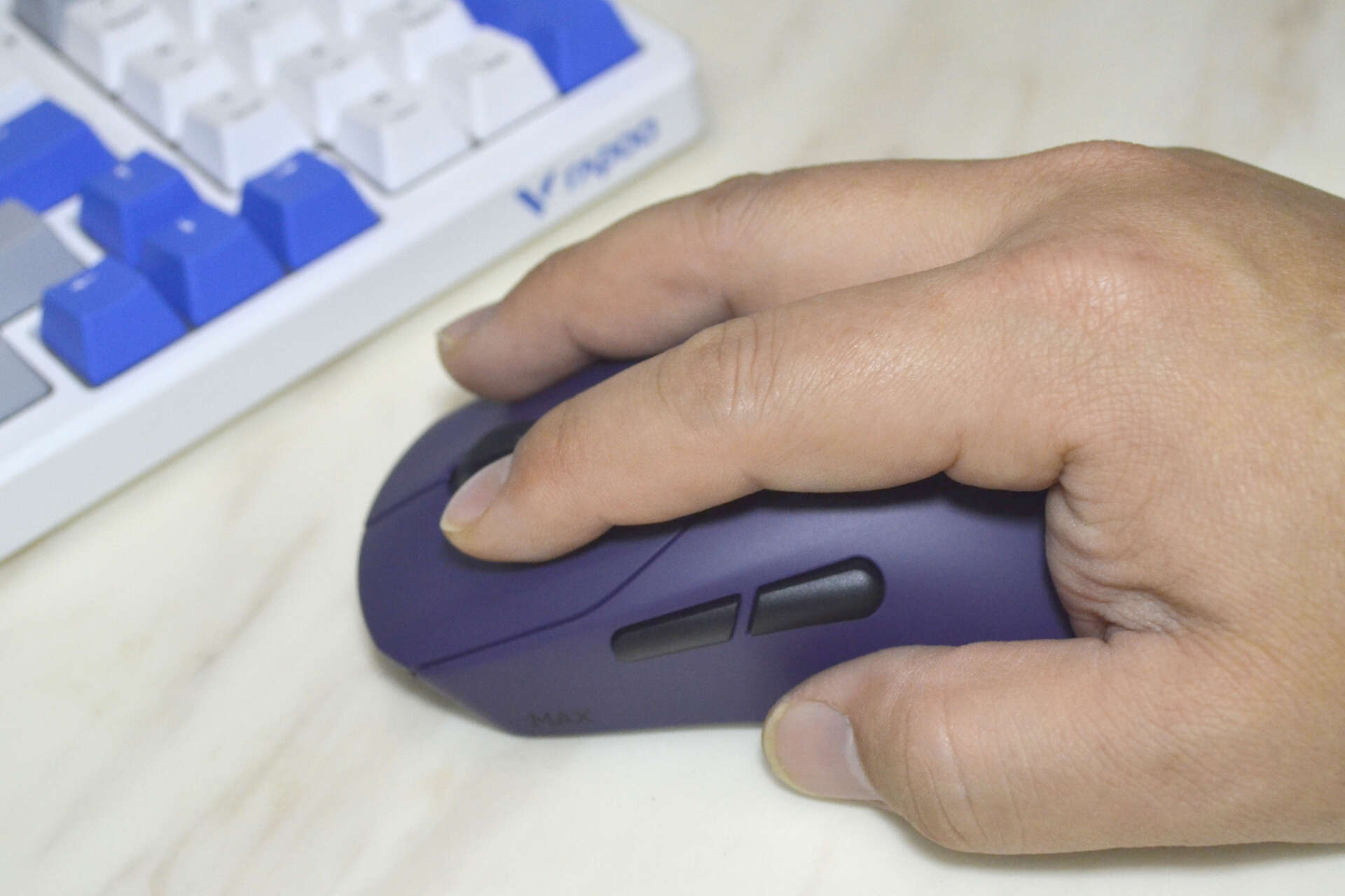 VT9 MAX鼠标定位中大手型(适配17.5-19cm手长),采用右手对称设计,相比初代产品更修身,重量控制在53g左右,轻量化设计减轻了长时间握持的手部负担。其宽体三角区与内凹侧腰形成天然的发力点,大小鱼际能牢牢贴合鼠标表面,拇指和小指自然摆放,无论是抓握时的快速提拉、微调,还是趴握时的稳定支撑,都能找到舒适的姿势。中高背的饱满弧度的设计,让趴握时掌心得到充分填充,避免快速移动时的悬空感。平滑的顶部弧度则适配大手用户的指握习惯,多握持方式兼容,满足不同玩家的操作偏好。
