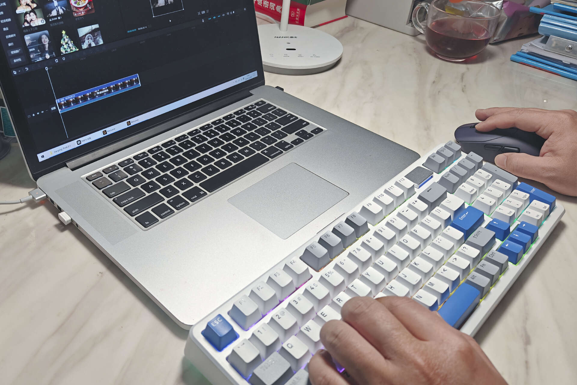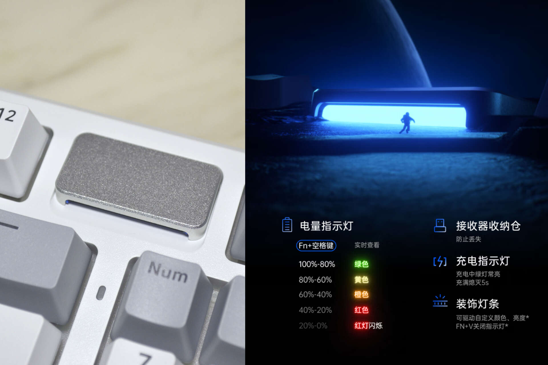 同时,在细节设计上兼顾“功能与美学”:键盘的“时空幻境仓”不仅承担电量提示功能,还具备收纳属性,可放置接收器等小配件。鼠标的对称设计与简洁线条,搭配低调的配色,既能融入电竞桌面的炫酷风格,也能适配办公场景的简约需求,做到“一械多用”。