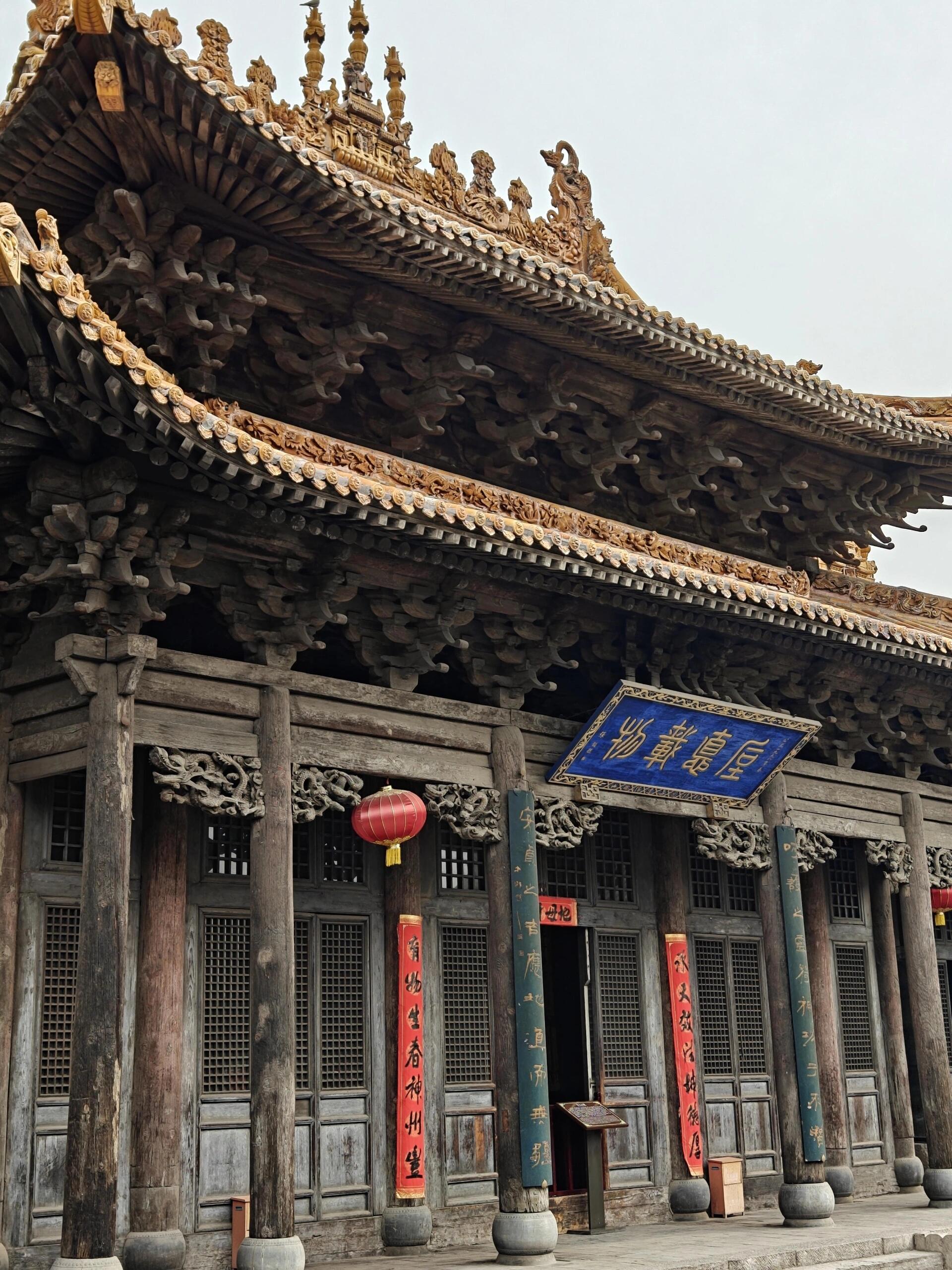 走到后土殿时,阳光正好斜照在金黄的琉璃瓦上,晃得人睁不开眼。五开间的大殿配着两侧的真武殿、三官祠,硬生生拼成了十一间的气势,像一位张开双臂的巨人。细看斗拱,下檐的五彩重昂层层叠叠,上檐的七踩三昂如花朵绽放,每一个榫卯都严丝合缝,却又在转角处故意留着微小的空隙——老匠人说,这是“留气口”,怕建筑太“满”会招来天灾。正脊上的凤凰戏牡丹琉璃雕更是惊艳,凤凰的尾羽展开有三米长,每一片羽毛都是单独烧制的,却严丝合缝,阳光底下,凤凰的眼睛竟会随着角度变换颜色。当地人说,这对凤凰是“活的”,月圆之夜会绕着脊顶飞,不信你看琉璃上的磨损痕迹,是不是像被翅膀扫过?