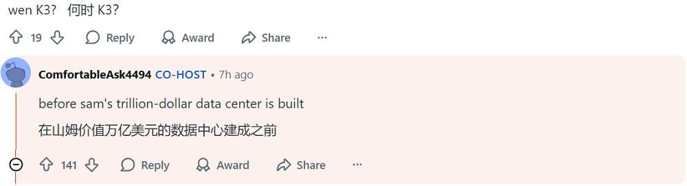 而当网友问及K3的发布时间时,杨植麟戏谑地回应道:“在Sam价值万亿美元的数据中心建成之前。”