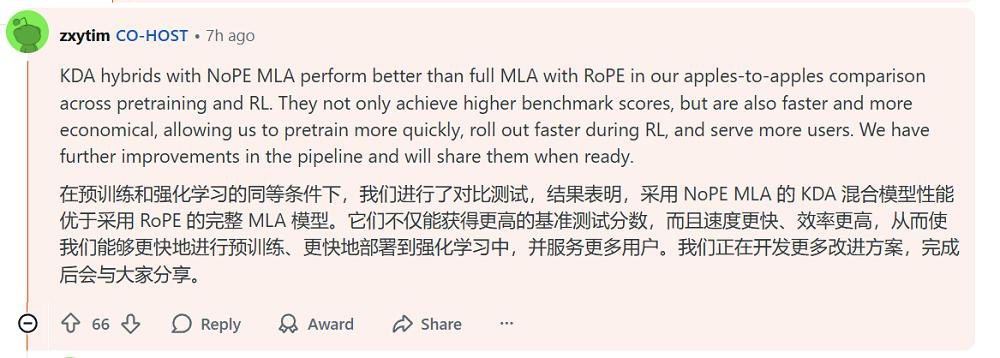 周昕宇在技术层面进一步解释了KDA的对比优势。他称,KDA混合架构结合NoPE MLA后,在预训练和强化学习阶段均优于采用RoPE的完整MLA。不仅基准得分更高,还更快、更经济,使他们能够更高效地训练、部署并服务更多用户。未来,月之暗面还有进一步改进,成熟后会公开。