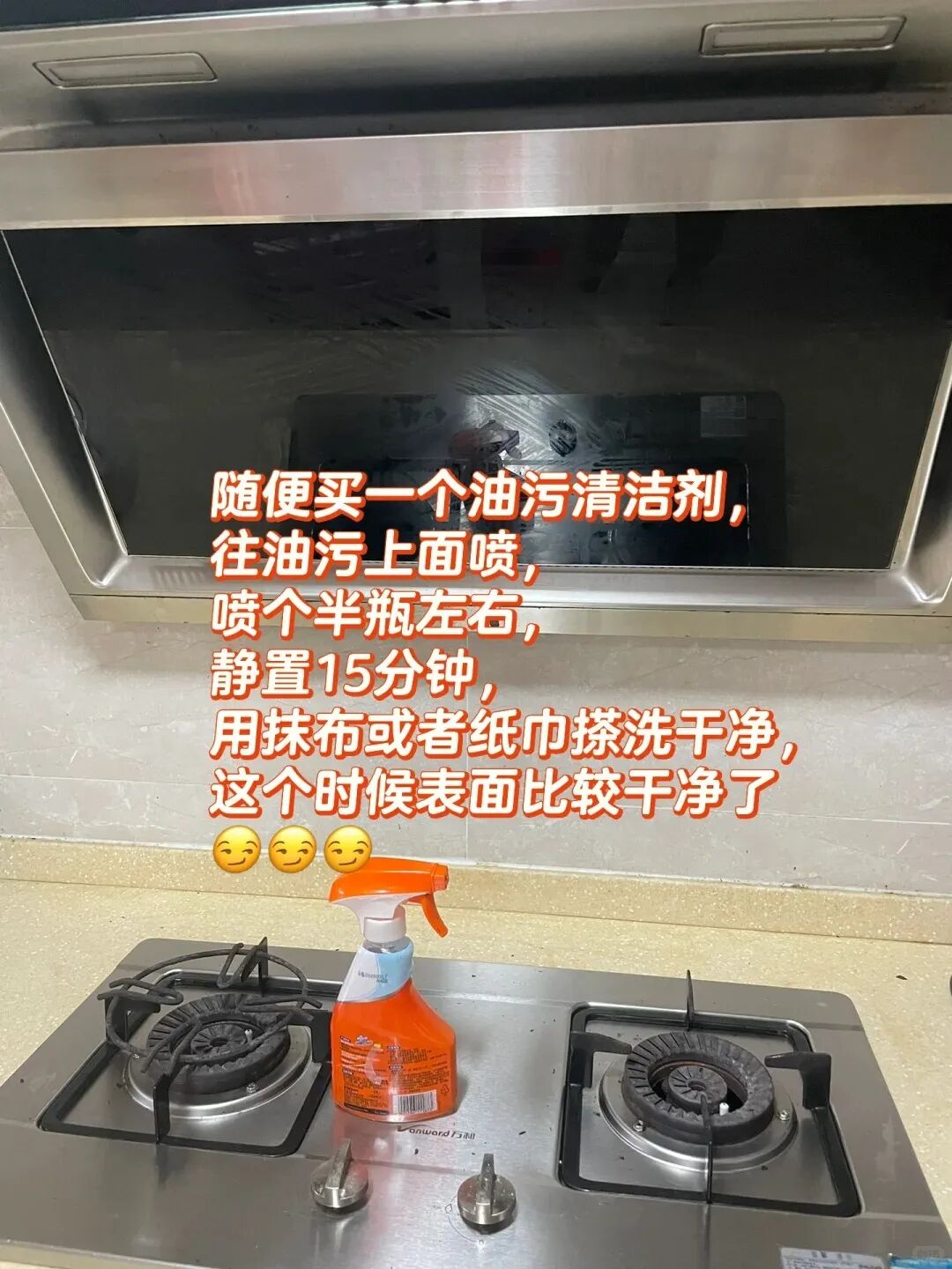 要是遇到顽固油污,可以用小苏打和白醋用温水混合均匀,在油污处喷上让它充分湿润,静置 5-10 分钟,再用抹布一擦,油污立马就干净了。