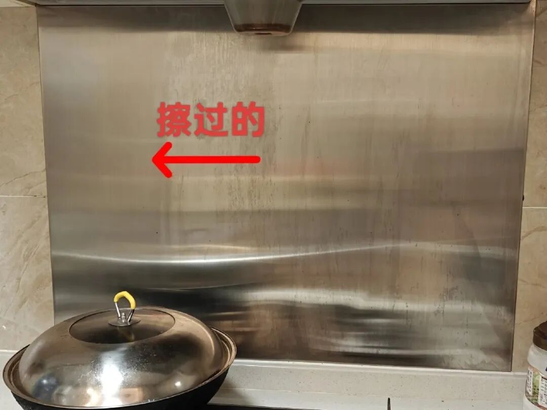 而厨房中的不锈钢面板处,原来她用油污净来擦,结果越擦越花,后面直接用厨房纸沾上点食用油,很轻松就擦得锃光瓦亮的,擦完之后再用干布擦一遍,擦出来的光泽,特别有质感。
