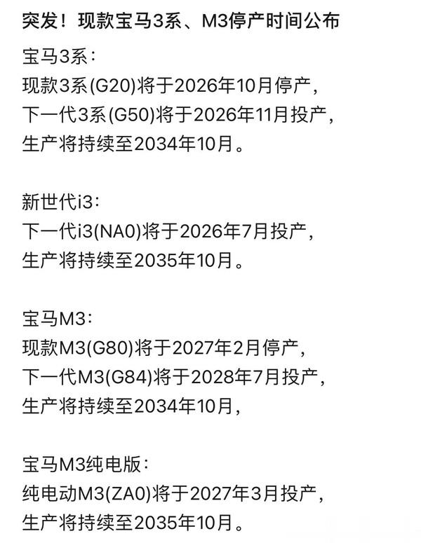【CNMO科技消息】2月28日,CNMO注意到,有关宝马3系、i3以及M3的现款停产与新款生产日期有了最新消息。据了解,现款宝马3系(G20)将于2026年10月停产,而下一代3系(G50)将在2026年11月投产,生产将持续至2034年10月。
