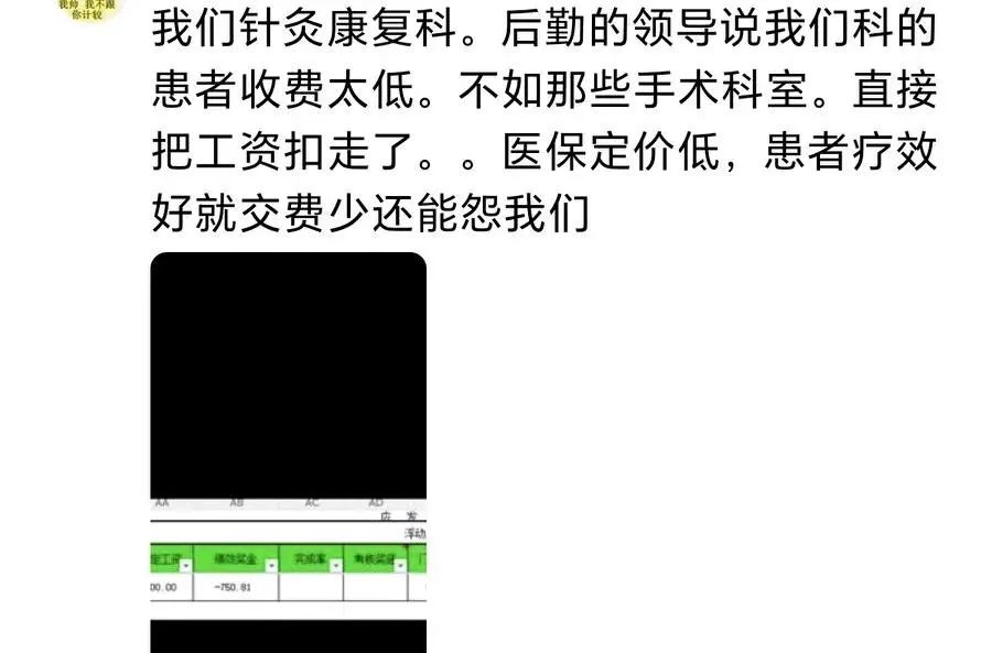8月10日,山东某医院针灸康复科一名医生发文表示:“我们针灸康复科绩效开始为负了,后勤的领导说我们科的患者收费太低,不如那些手术科室,直接把工资扣走了。医保定价低、患者疗效好,我们科收费确实少,但这还能怨我们吗?”