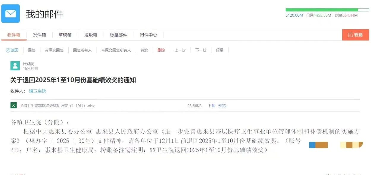 近日,广东一网友发帖爆料称,广东惠来县发布了要求下辖卫生院退回2025年1月至10月份基础绩效奖的通知。