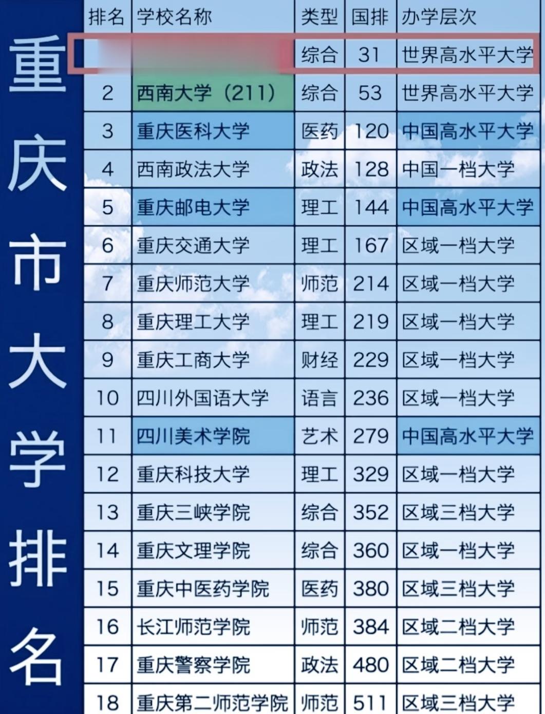 前几天翻到两份重庆高校排名表,越看越觉得有话想说。就拿重庆医科大学来说,在第一张表里它排第三,国排120,办学层次标着“中国高水平大学”;可到了第二张金字塔图里,它的位次又往前挪了,国排到了111。但在很多外省考生眼里,重医甚至不如一些东部双非一本“有名”——可只有在重庆待过才知道,重医附一院、附二院在本地的分量,不亚于某些985高校的附属医院。我有个学临床的朋友,当年分数够得上末流985的冷门专业,偏偏选了重医的临床医学,现在在附一院规培,说“本地医院招人,重医的牌子比很多省外211都好用”。