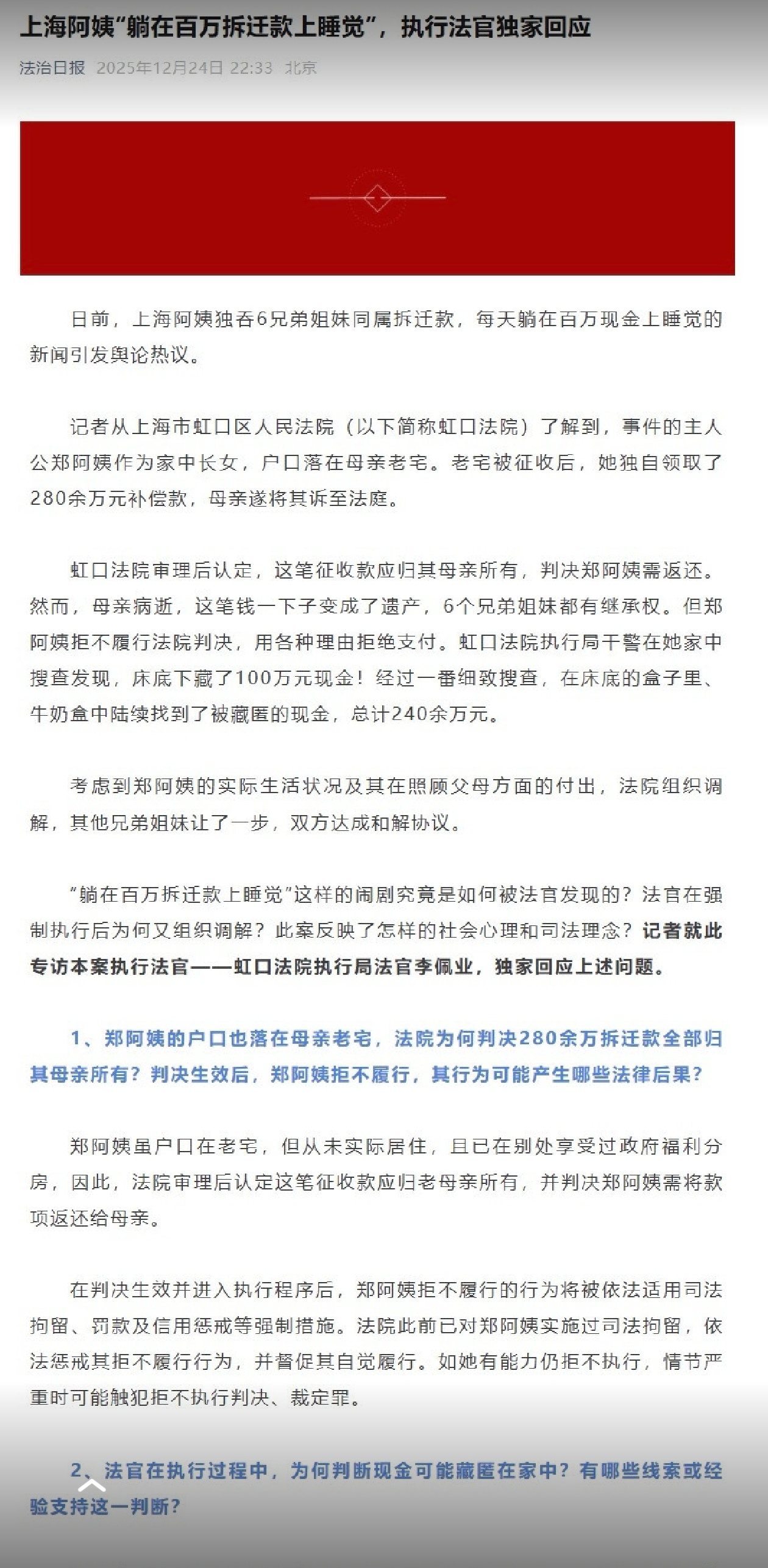 这不是段子,这是前几天上海虹口法院执行局给我们上演的现实版“荒诞剧”。当法官掀开床板,看到那一摞摞崭新的百元大钞时,我估计那画面感强得,连最会写剧本的编剧都得甘拜下风。