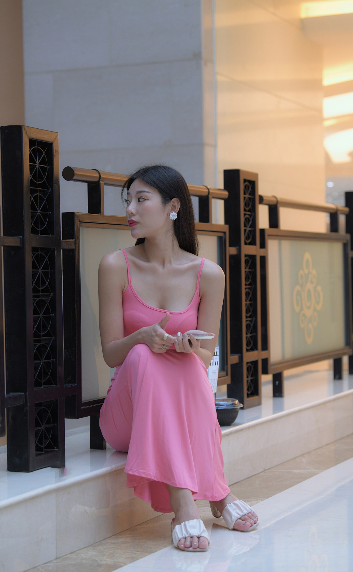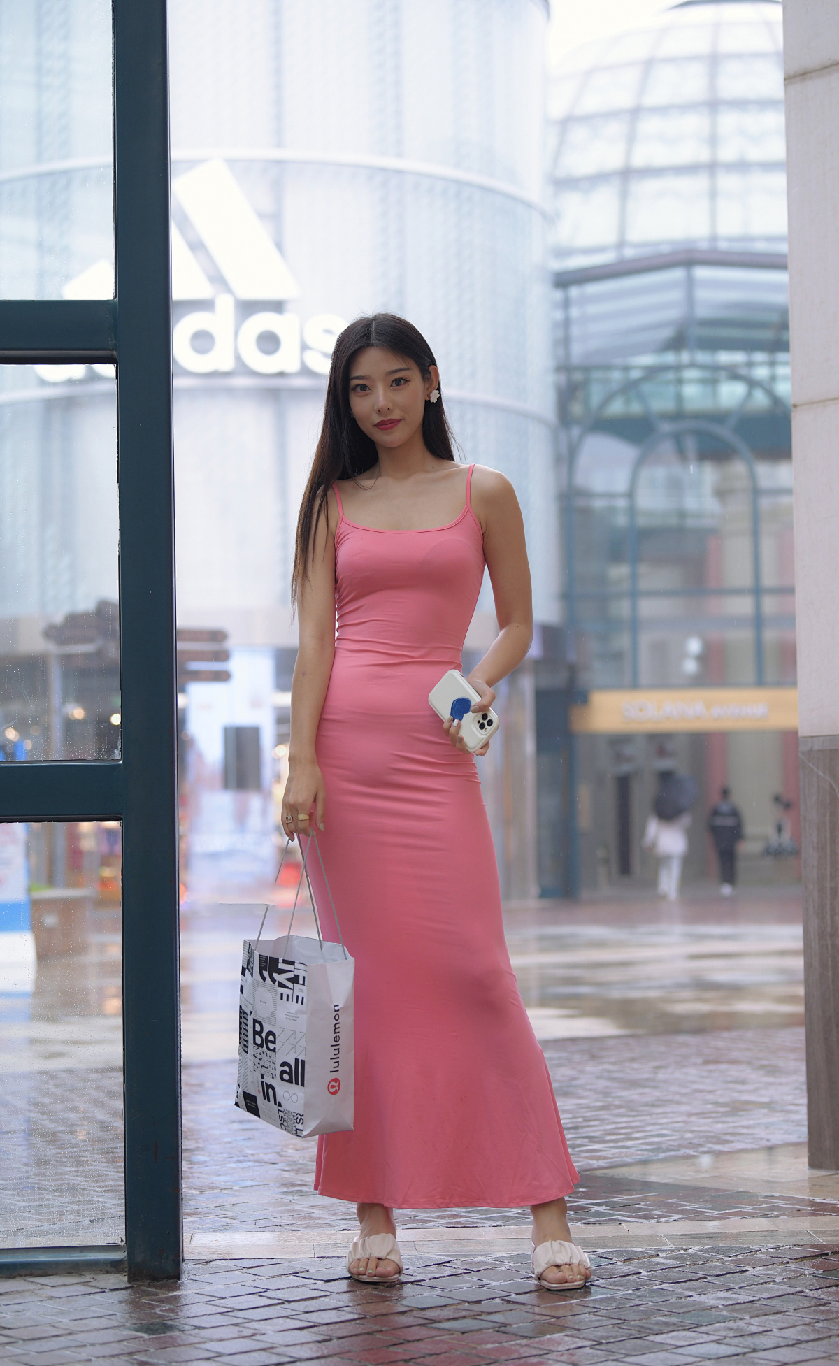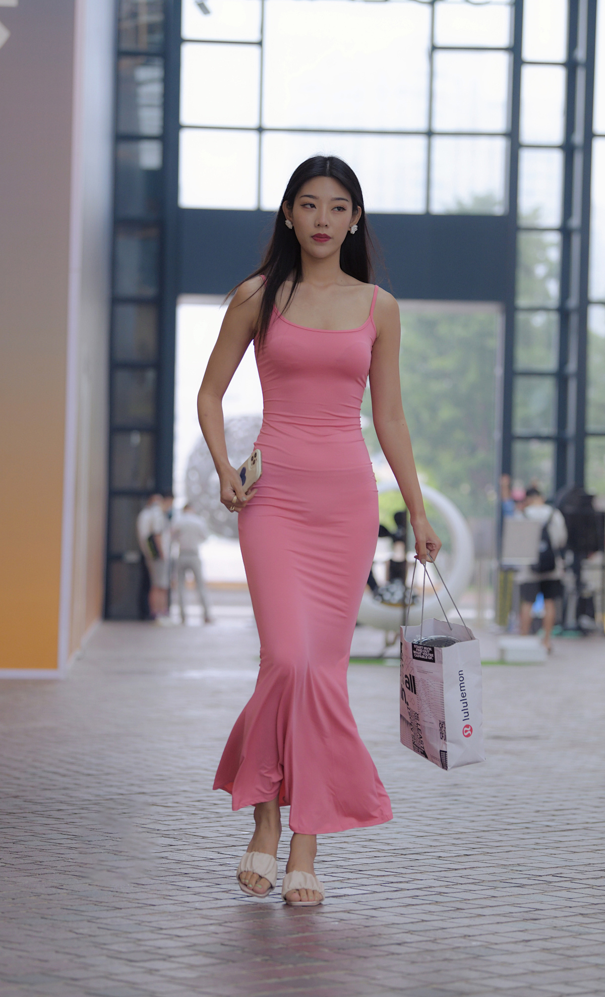 身穿粉色吊带修身长裙,脚踩浅色凉鞋,于绿植与彩色街景中,尽显优雅气质。整体为清新时尚的都市休闲风。