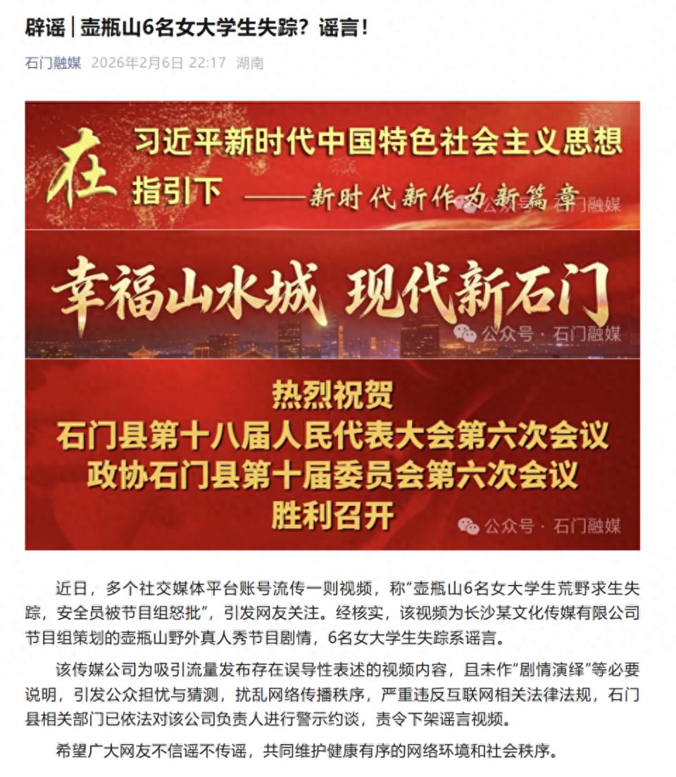 近日,多个社交媒体平台账号流传一则视频,称“壶瓶山6名女大学生荒野求生失踪,安全员被节目组怒批”,引发网友关注。经核实,该视频为长沙某文化传媒有限公司节目组策划的壶瓶山野外真人秀节目剧情,6名女大学生失踪系谣言。