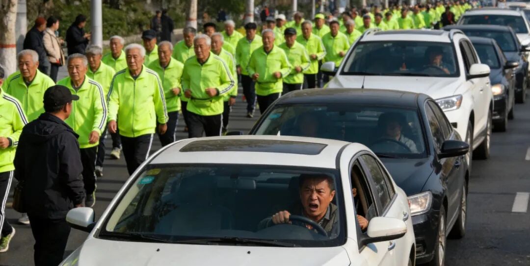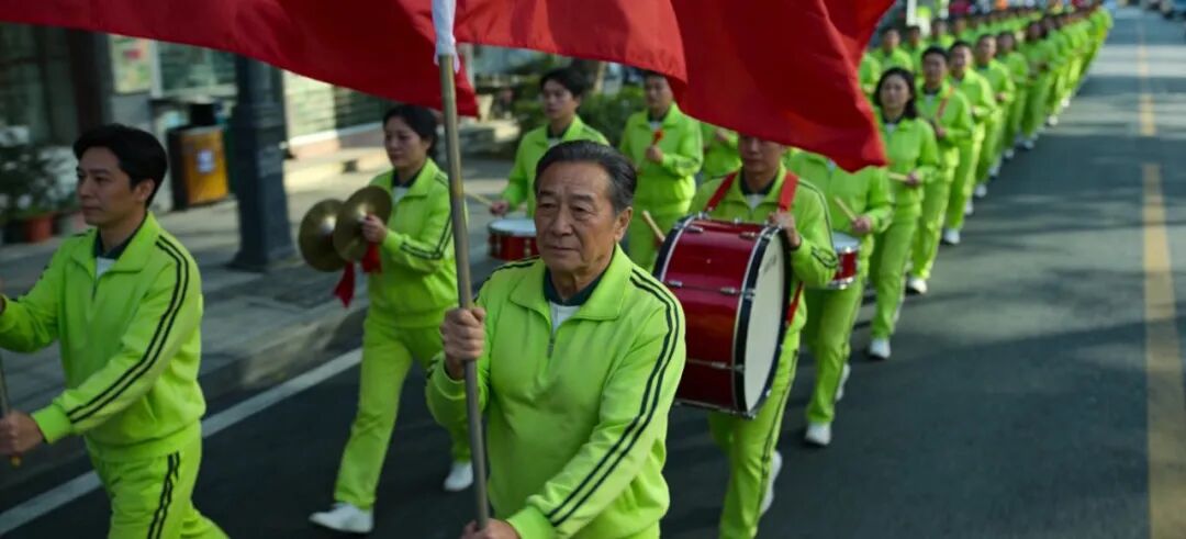 一队人,穿着荧光绿的运动服,跟一条大蜈蚣似的,扛着红旗,放着咚咚咚的音乐,走路砸地响。老李在里头,胸脯挺得老高。