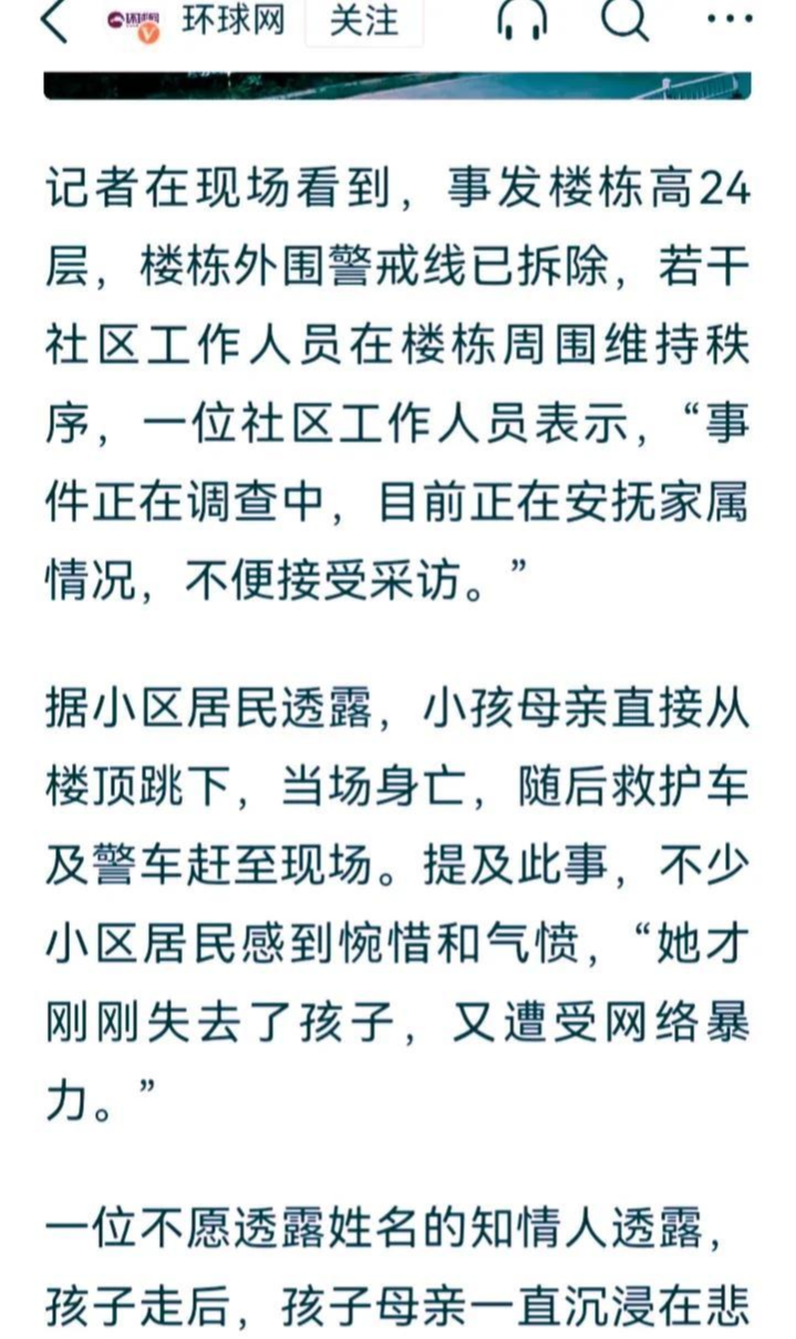 一位不愿透露姓名的知情人透露,孩子走后,孩子母亲一直沉浸在悲痛当中,后来又遭到了“网暴”。