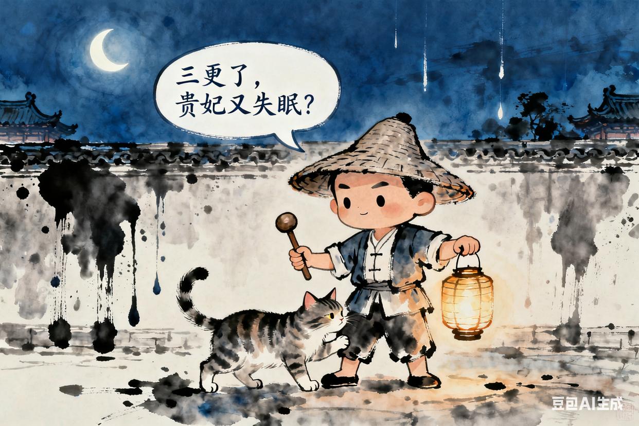 金句:(虚构)“三更了,贵妃宫里还亮着灯,她又失眠了吗?”