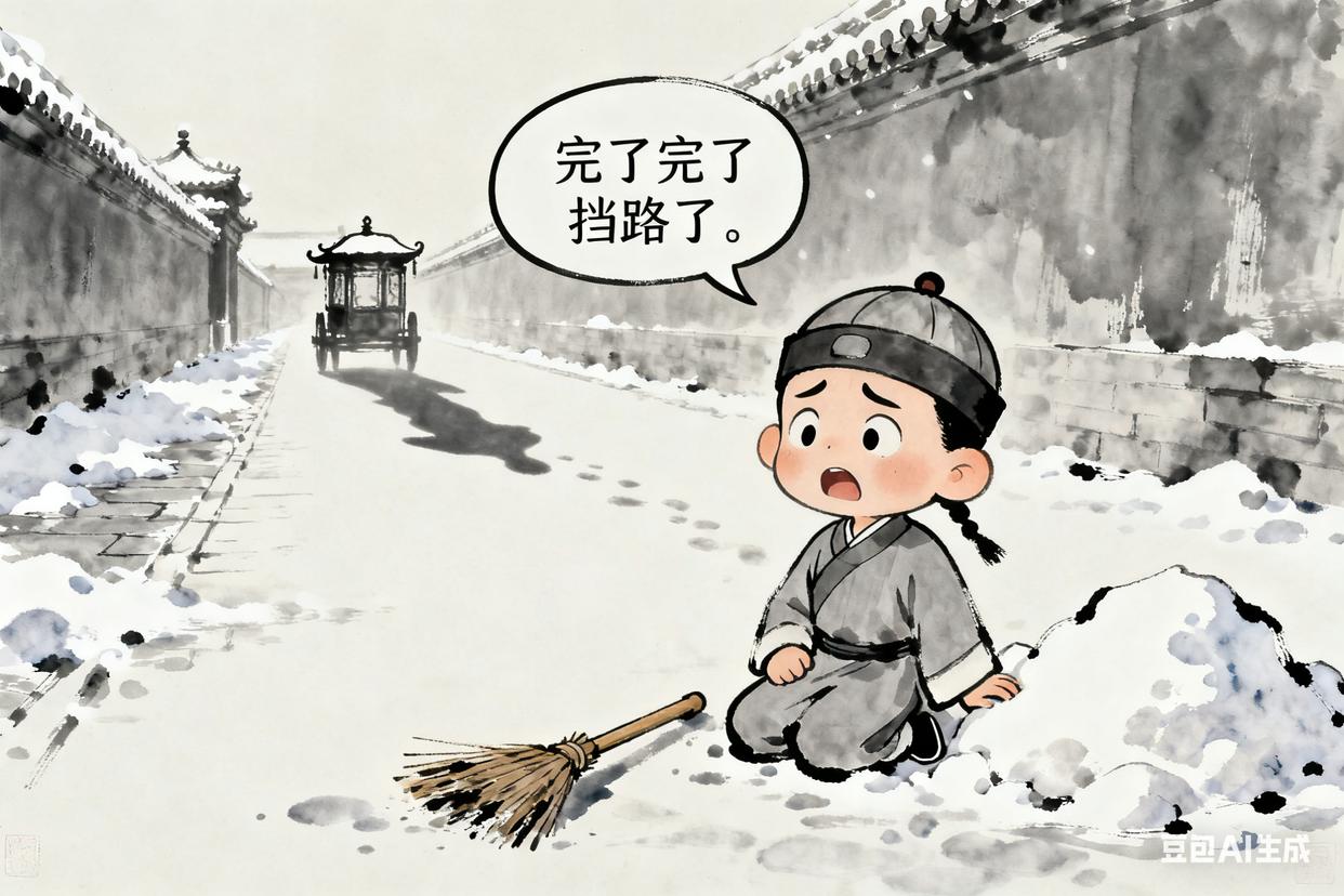 故事:某年冬天下雪,他负责扫雪,不小心把雪堆成了“小山”,挡了贵妃的路,被罚跪一夜。
