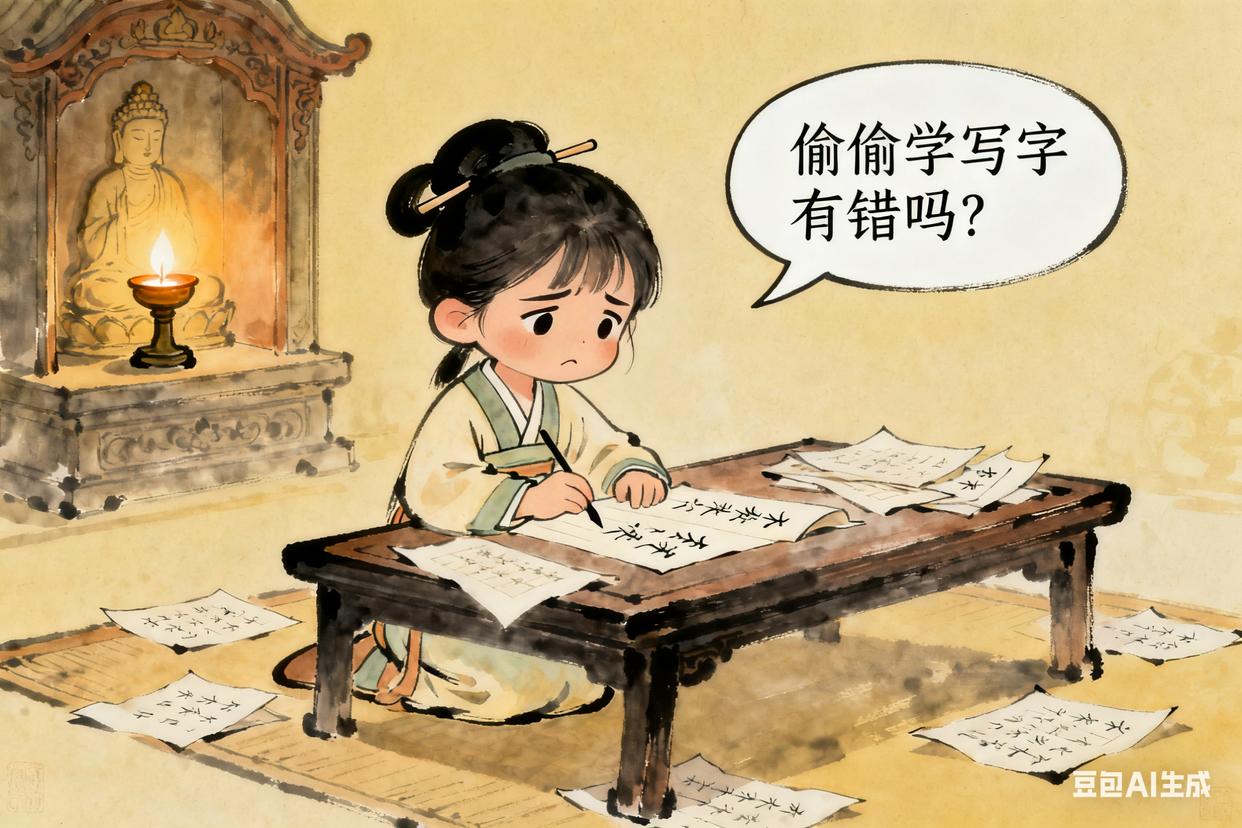 故事:她偷偷捡贵人丢的字纸学写字,被抓到后罚抄《金刚经》一百遍。