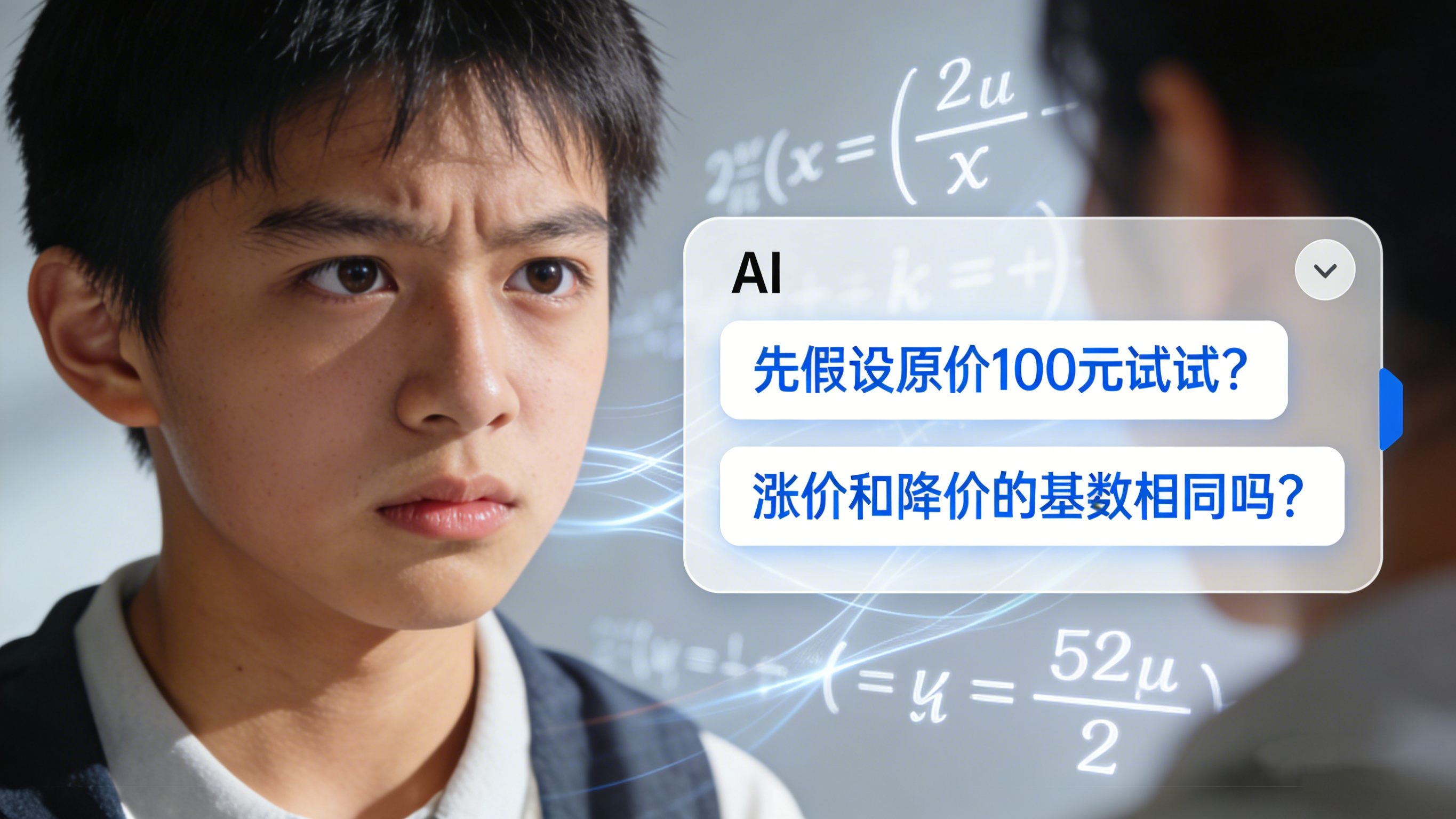 按照提示计算后,我们得出“100元先涨20%是120元,再降20%是96元”的结果,这时候AI顺势追问:“你看,100元经过先涨后降20%后变成了96元,这说明什么?涨价和降价的基数一样吗?” 这时候我们已经意识到“涨价基数是原价,降价基数是涨价后的价格,两者不一样,所以不能抵消”。