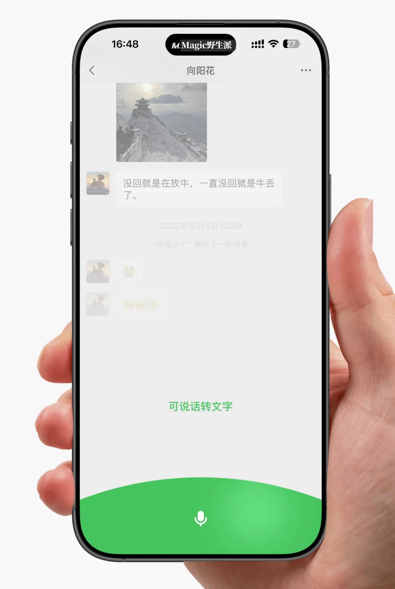 语音转文字长按功能现在长按这个麦克风按钮·就可以进行语音转文字,松开后即可发送,上滑可以直接取消;