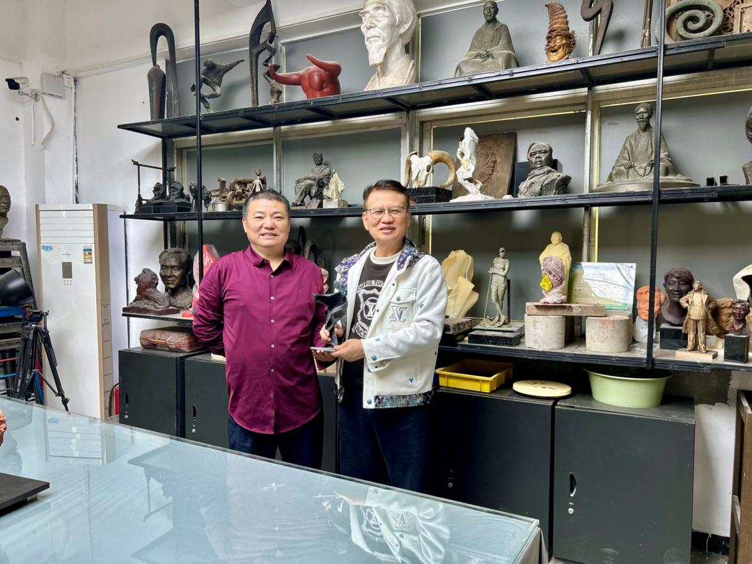 2025年冬月,何华(左)在其工作室接待笔者