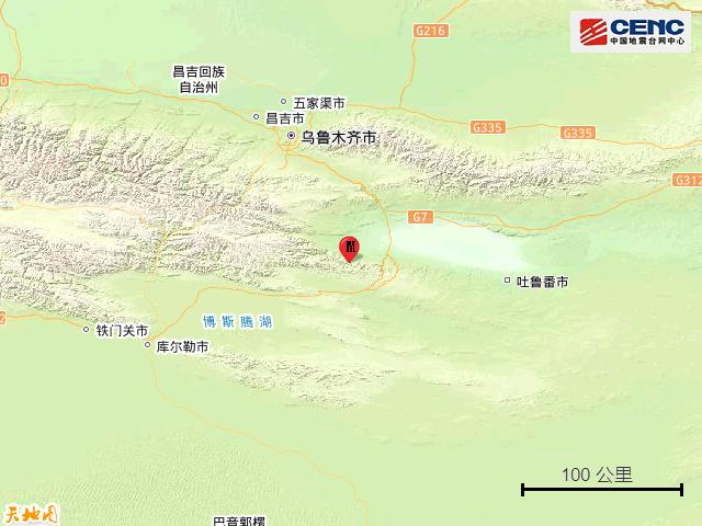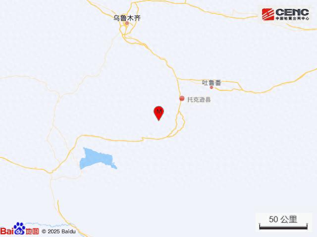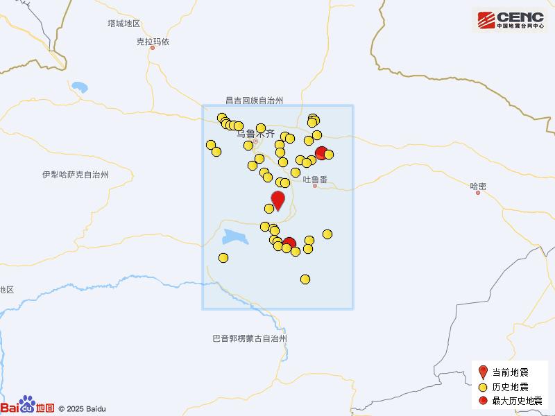 历史地震: 根据中国地震台网速报目录,震中周边200公里内近5年来发生3级以上地震共59次,最大地震分别是2025年10月27日在新疆吐鲁番市托克逊县发生的4.7级地震(距离本次震中89公里)和2022年12月13日在新疆昌吉州奇台县发生的4.7级地震(距离本次震中147公里),按震级大小前50次历史地震分布如图。