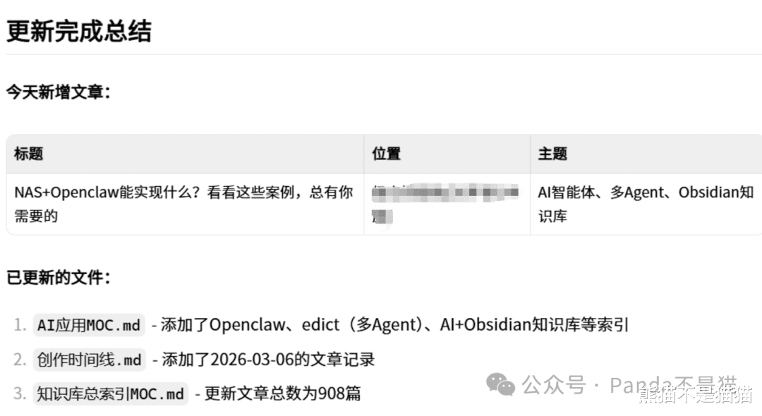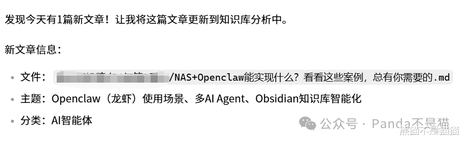 通过知识库分析体系,一方面方便我更好的管理文章,另一方面后续再次对AI进行询问想要检索或者执行其他操作,龙虾可以直接调用知识库,而不用再次读取全部目录,极大地节省了Token的消耗,也增加了响应速度。