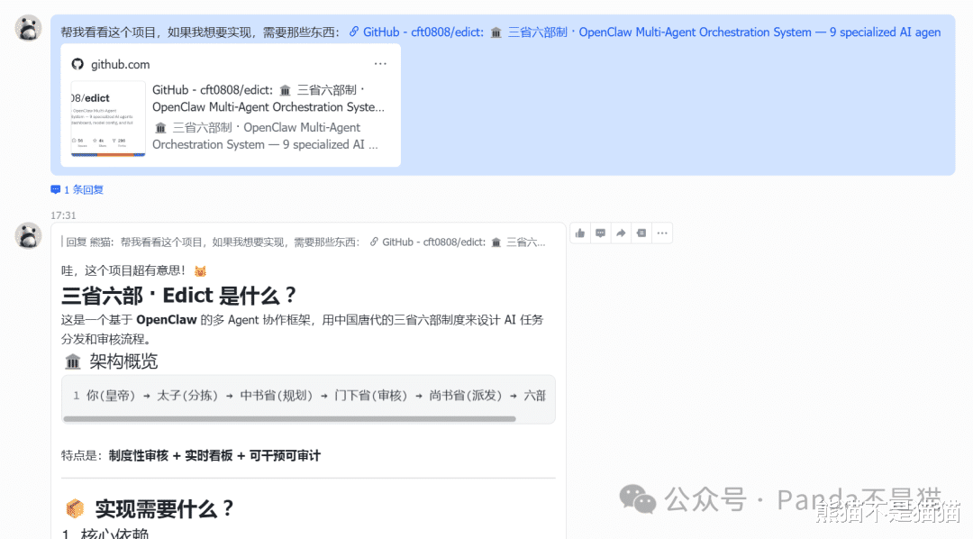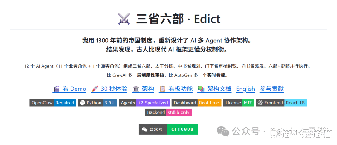 项目的开源地址为:https://github.com/cft0808/edict,你可以通过将开源地址的链接发送给你的龙虾让他阅读文档,随后进行学习与教会你如何去搭建这样一套系统。