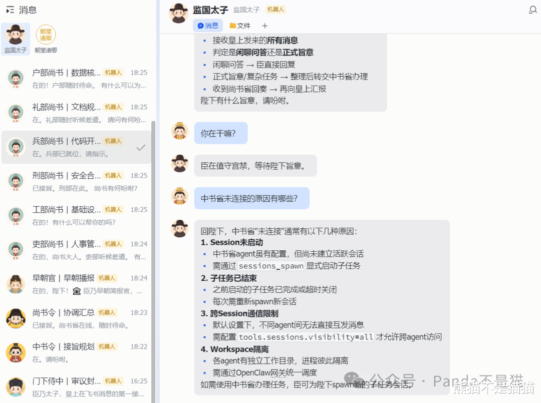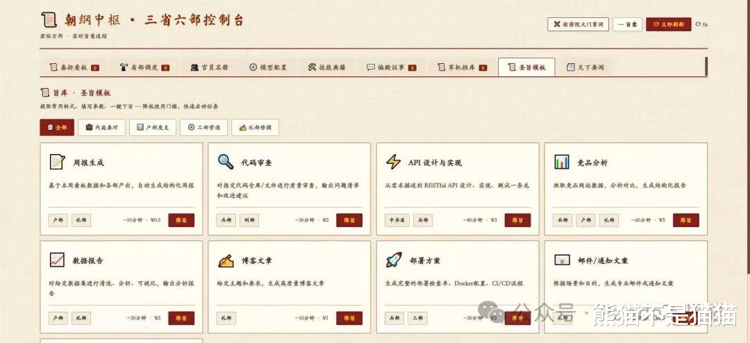 项目主要是将多Agent的形式设计成了古代的三省六部制,各部门之间各司其职分工协作,让你拥有一种统领大局的感觉,既实现了任务的执行,也让你拥有极大的满足感(不知道后续会不会开发后宫功能,用来满足情绪价值)