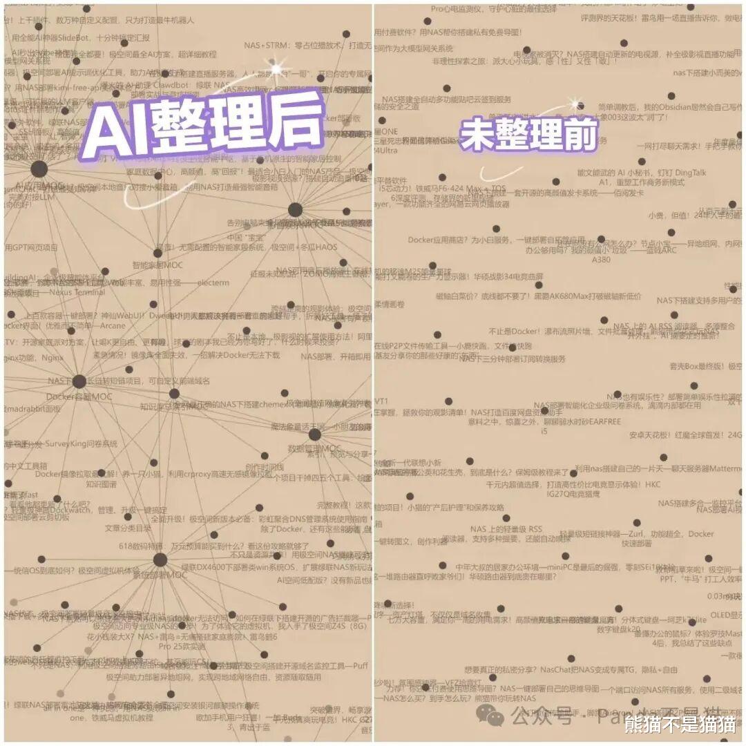 最后,通过龙虾+Obsidian的形式,我实现了更完整的关系图谱,最早的关系图谱和现在的关系图谱参考图如下。未整理前每个文件都是单独存在,因为早期并没有整理的习惯,后期文件量太大了就懒得整理,而龙虾介入之后,这个过程就不需要我手动去操作了。