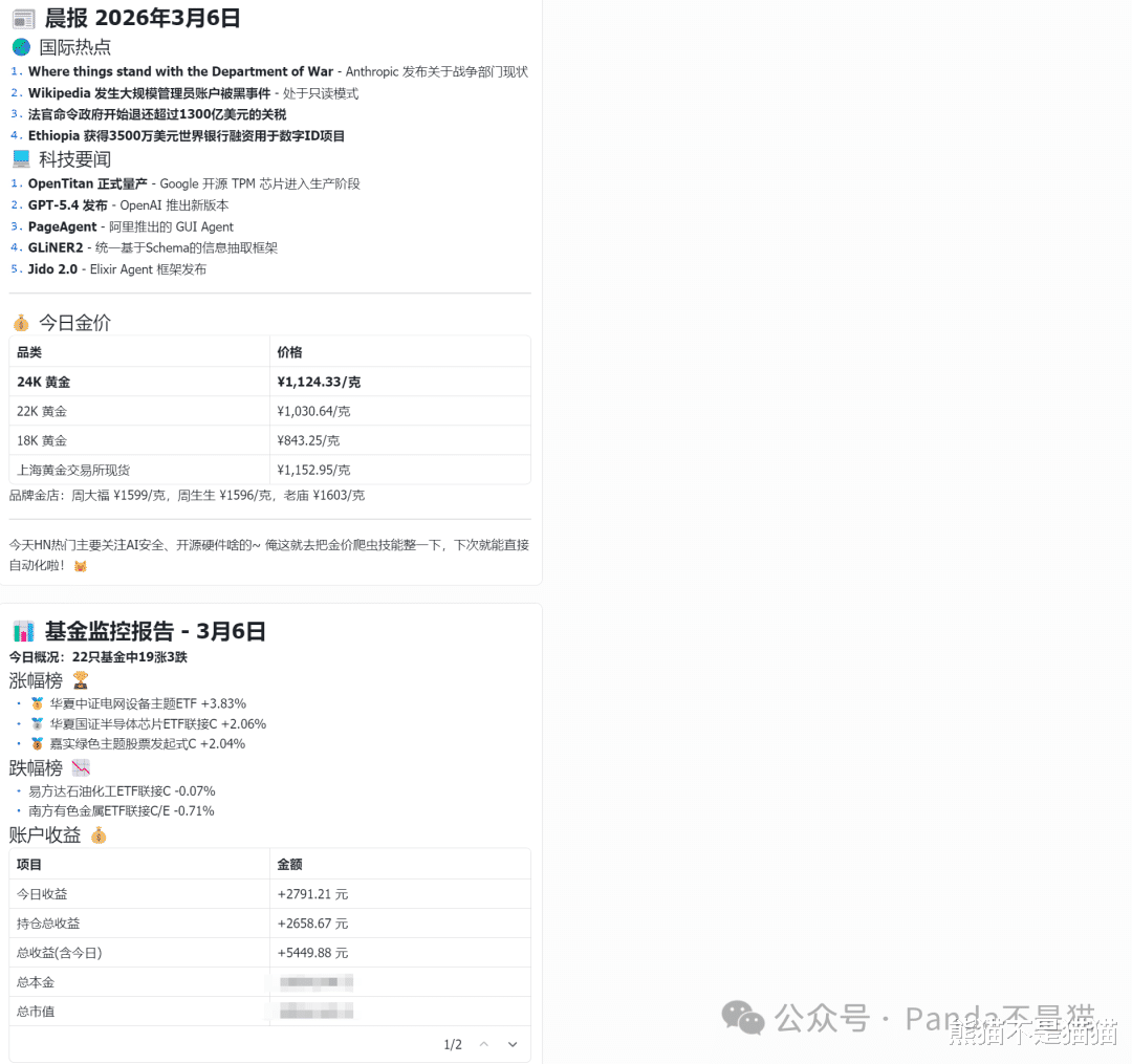 除了上述的帮助极空间来实现自动化的部署Docker、管理Docker,同时你也可以让他汇报每日你想要关注的新闻,同时也能进行基金收益监控。