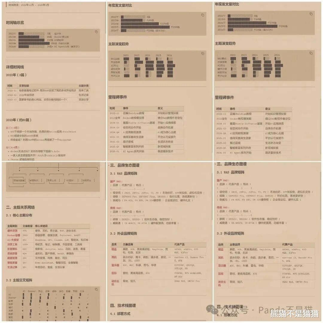 通过AI介入,我让龙虾阅读了我的所有文章,随后通过它的理解帮我建立了知识库分析,包括了各个类目的MOC、创作时间线、知识图谱以及知识库的总索引。
