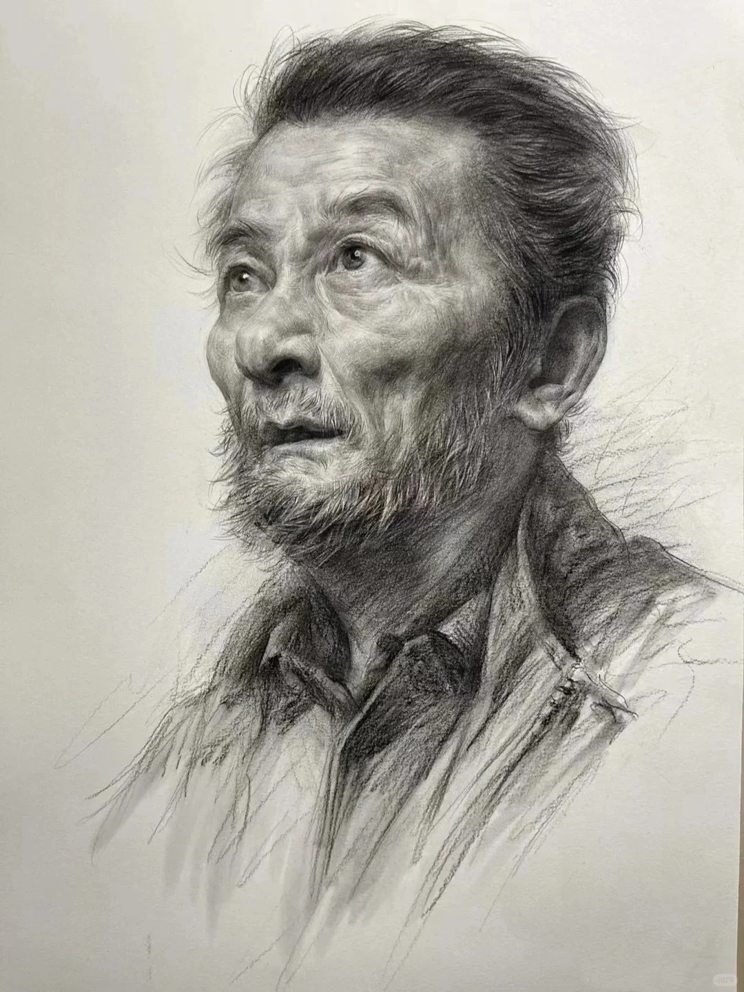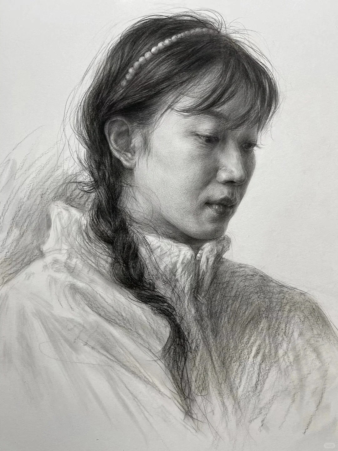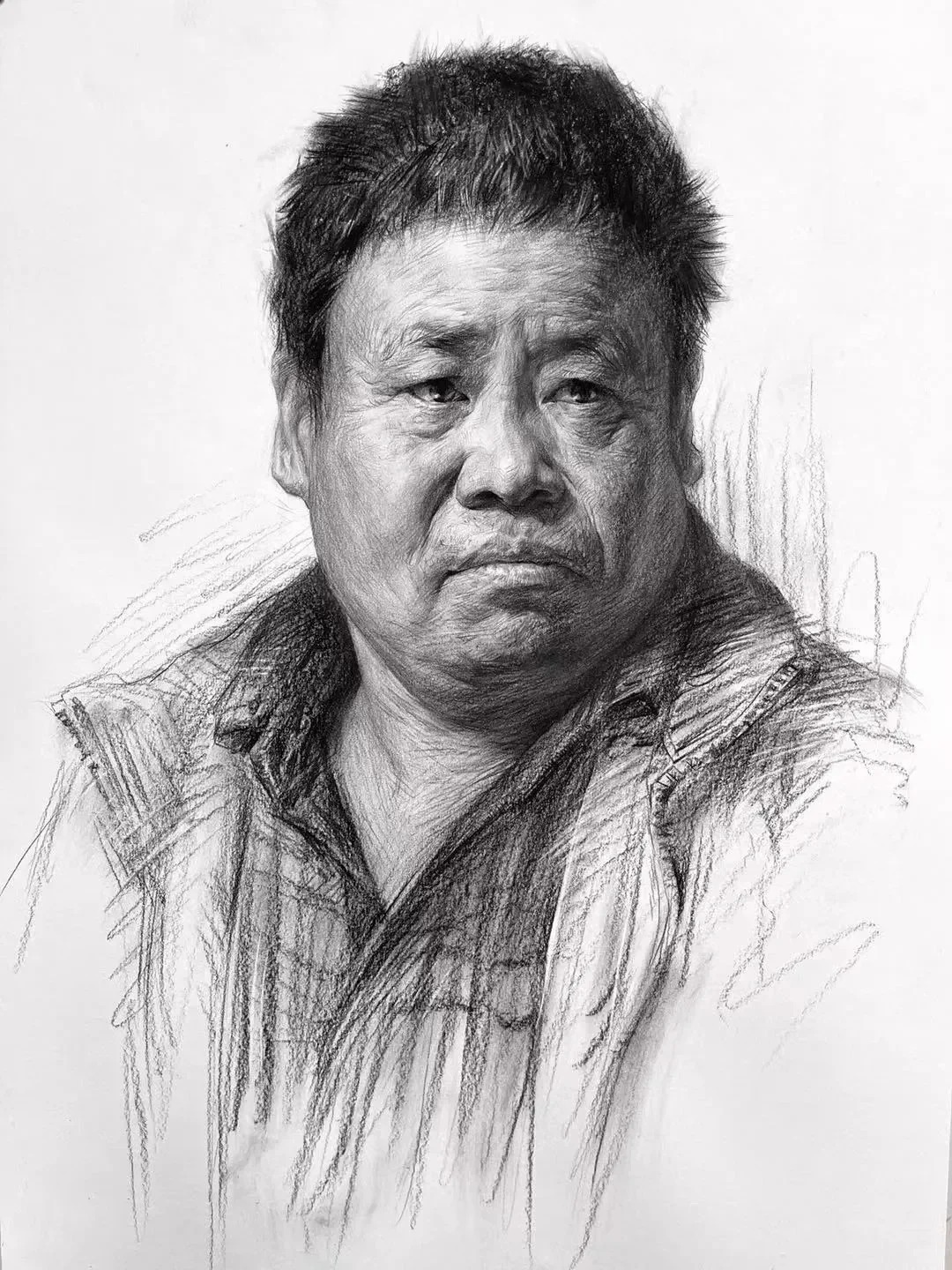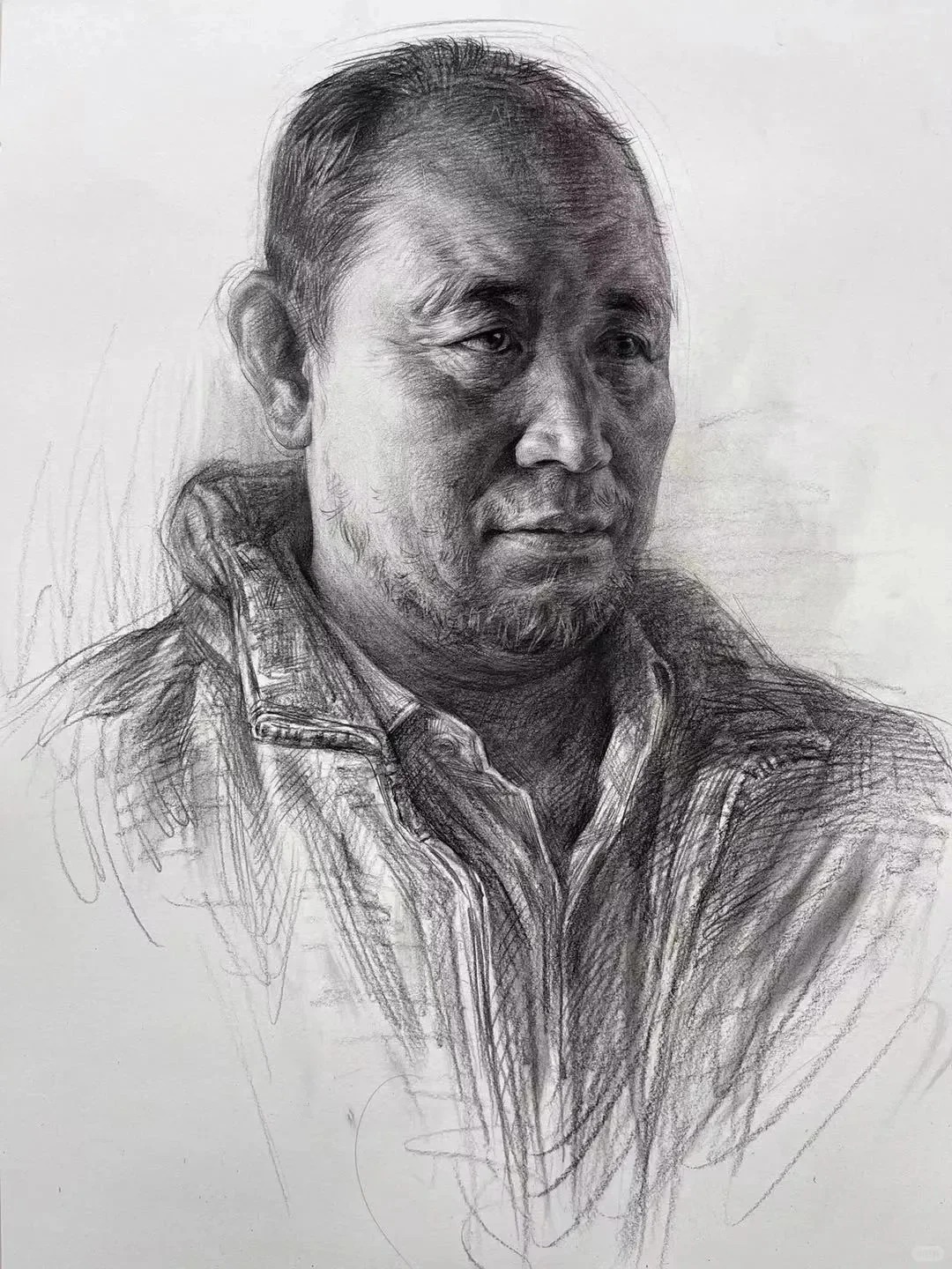 光影与质感的处理是亮点。蓬松卷发的丝缕感、布料褶皱的厚重感、不同年龄皮肤的肌理差异,全靠层次分明的排线实现,而不是磨调子。调子松而不散,暗部透气、亮部精准,保住了写实素描的细腻度,又带着手绘的生动性,避免了应试素描常见的油腻感。