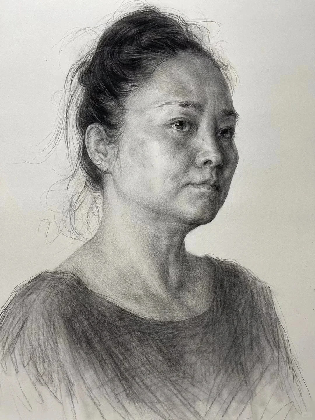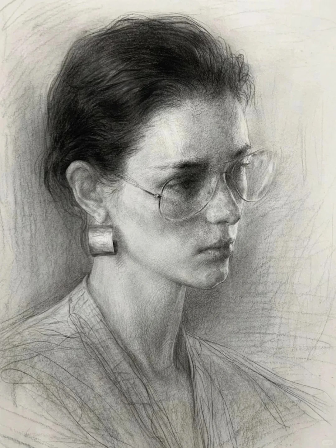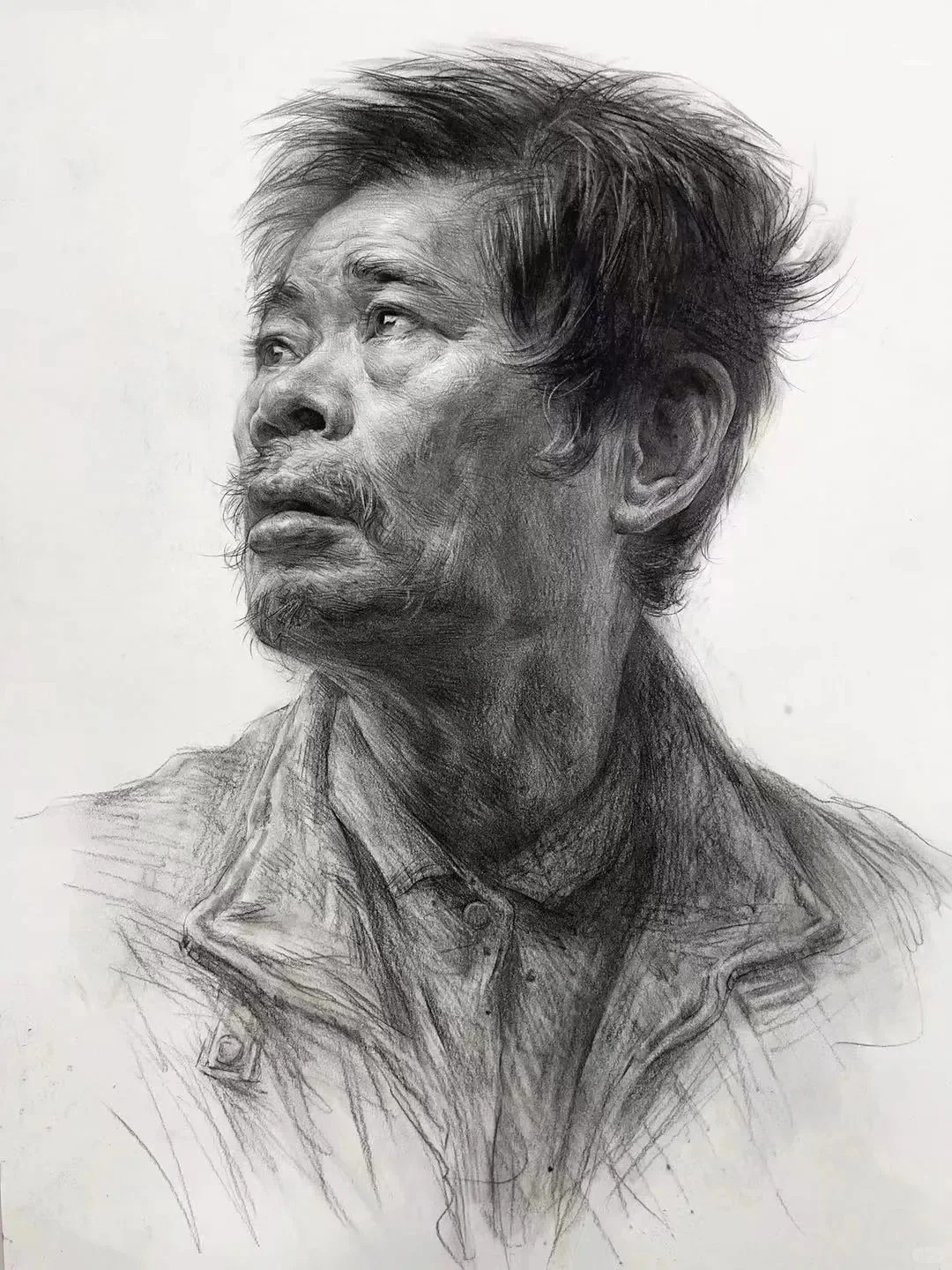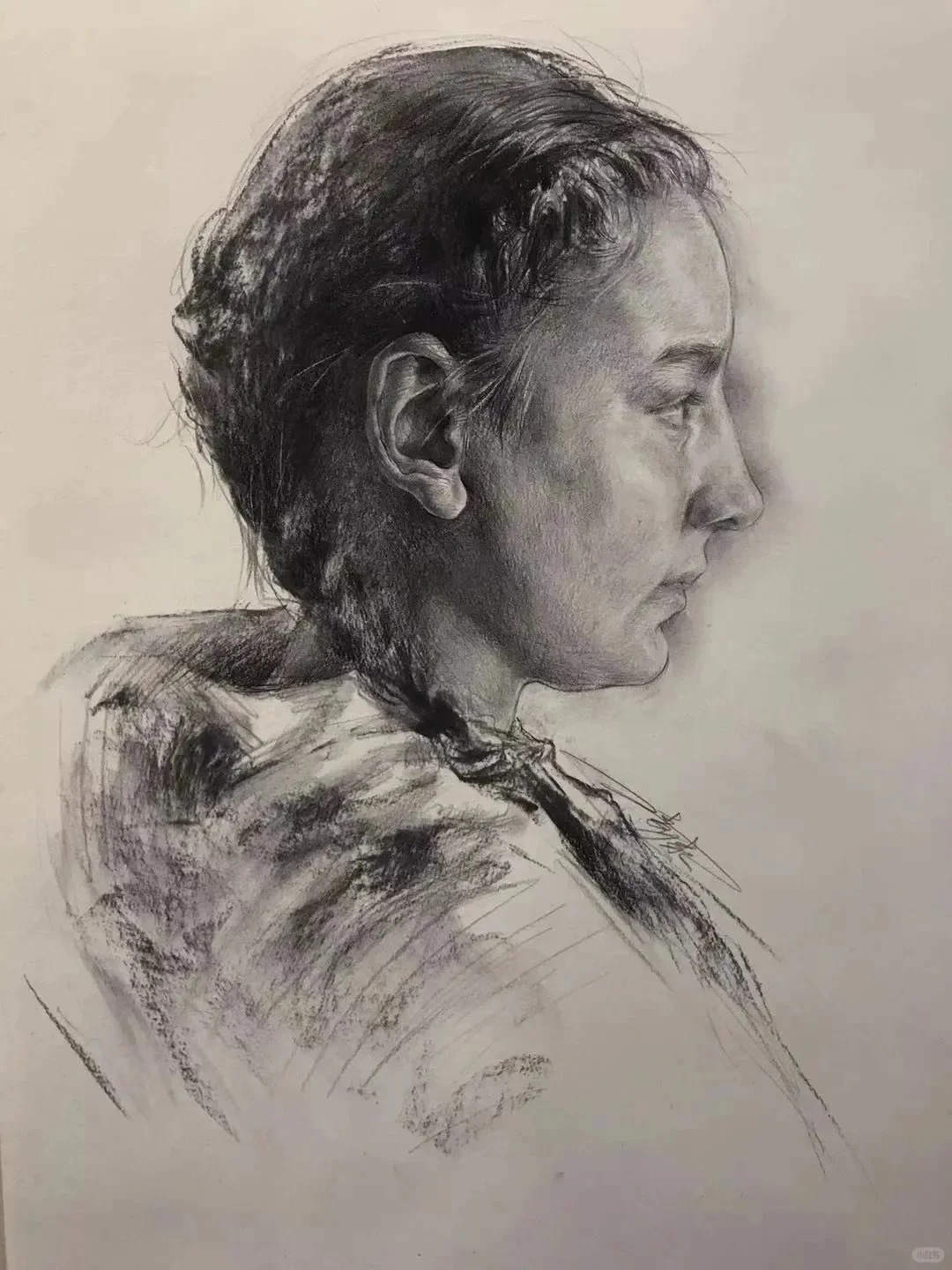 光影与质感的处理是亮点。蓬松卷发的丝缕感、布料褶皱的厚重感、不同年龄皮肤的肌理差异,全靠层次分明的排线实现,而不是磨调子。调子松而不散,暗部透气、亮部精准,保住了写实素描的细腻度,又带着手绘的生动性,避免了应试素描常见的油腻感。