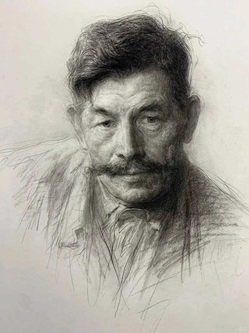 造型上,他的头骨、肌肉结构表达堪称教科书级。老人松弛的颧肌褶皱、年轻人紧俏的下颌骨转折,笔触生动,没陷入死抠结构的僵硬,又让人能清晰的感知人体解剖逻辑,这对高考学生建立造型认知、考研考生深化结构理解,都是直观的示范。