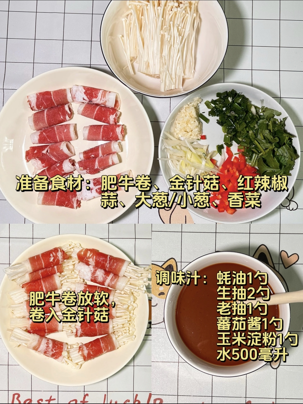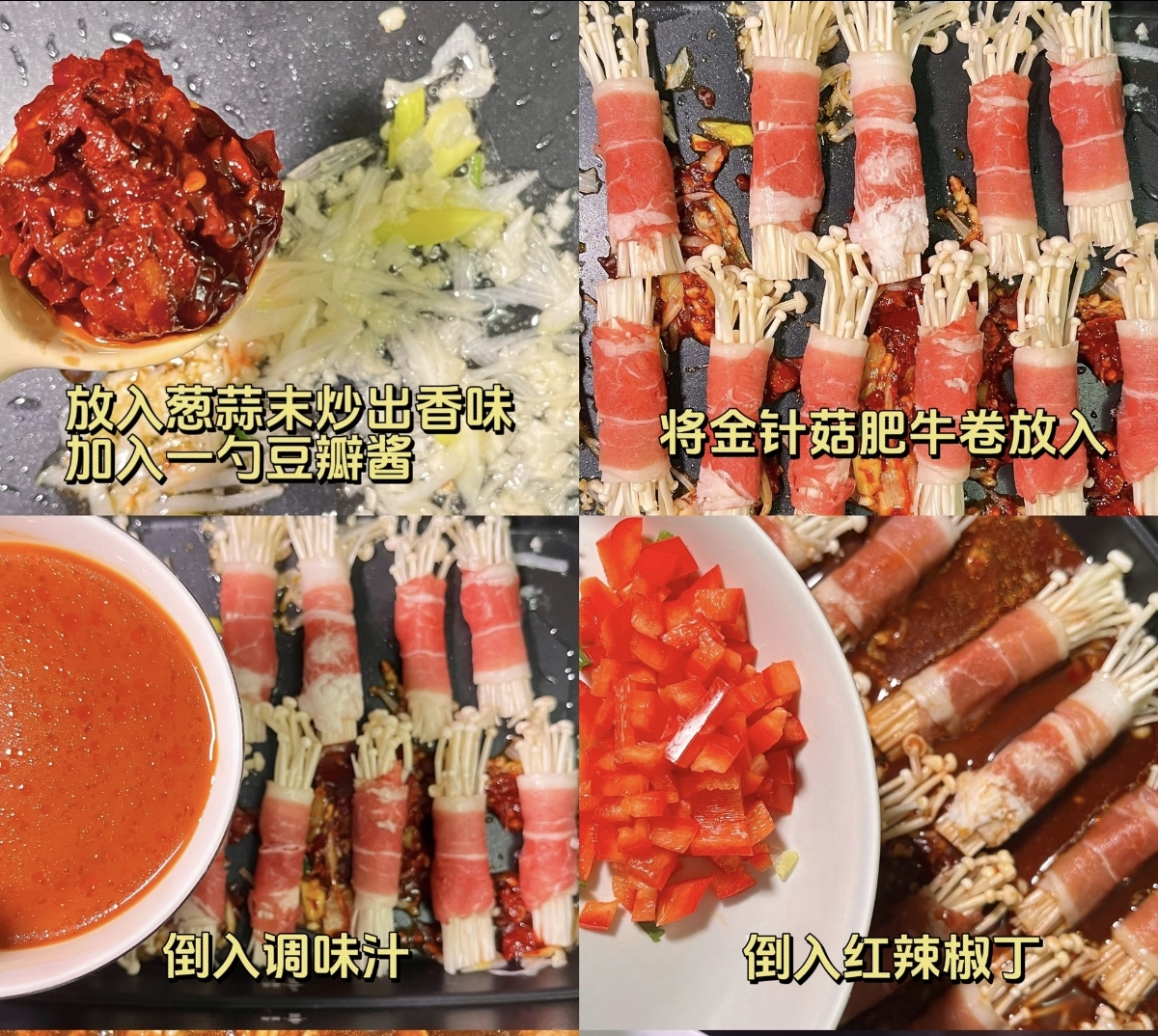 接着处理主料,将新鲜的金针菇切去根部,仔细清洗干净,分成大小均匀的小束。取一片薄而均匀的肥牛片,平铺在案板上,将一小束金针菇放在肥牛片的一端,慢慢卷起,让肥牛紧紧包裹住金针菇,形成紧实的卷状。卷的时候不用过于用力,保持自然的形态即可,这样煎制时不容易散开。全部卷好后,整齐地码在盘中,红白相间的模样,已经让人开始期待成品的美味。