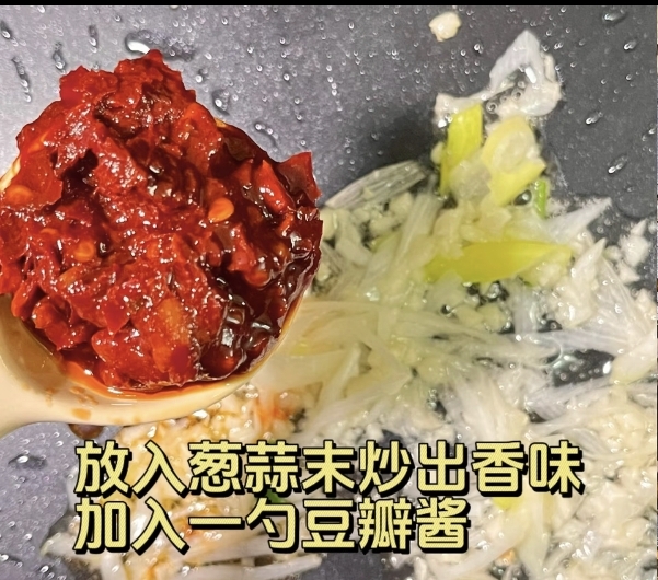 起锅开小火,倒入少许食用油,待油温微微升高,将切好的葱花和蒜末倒入锅中,慢慢煸炒出浓郁的香味,葱蒜的辛香瞬间在厨房里弥漫开来。此时加入一勺豆瓣酱,继续翻炒,直到豆瓣酱炒出红油,色泽变得红亮,香味彻底释放,这一步是赋予锅底醇厚风味的关键,能让整道菜的味道更有深度。