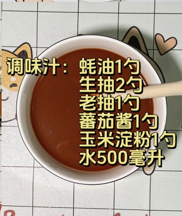 制作这道菜的第一步,是准备好灵魂酱汁,它是整道菜风味的核心。取一个干净的小碗,依次倒入两勺生抽、一勺蚝油,用它们奠定咸鲜的基础;再加入半勺老抽,一勺番茄酱,为酱汁赋予诱人的红棕色;一勺淀粉则负责让汤汁变得浓稠,更好地挂在食材表面;少许白糖能巧妙中和咸味,提鲜的同时让味道更有层次;最后倒入半碗清水,用筷子充分搅拌均匀,直到没有淀粉颗粒,一碗色泽透亮、香气馥郁的酱汁便备好了,静静等待与食材的相遇。