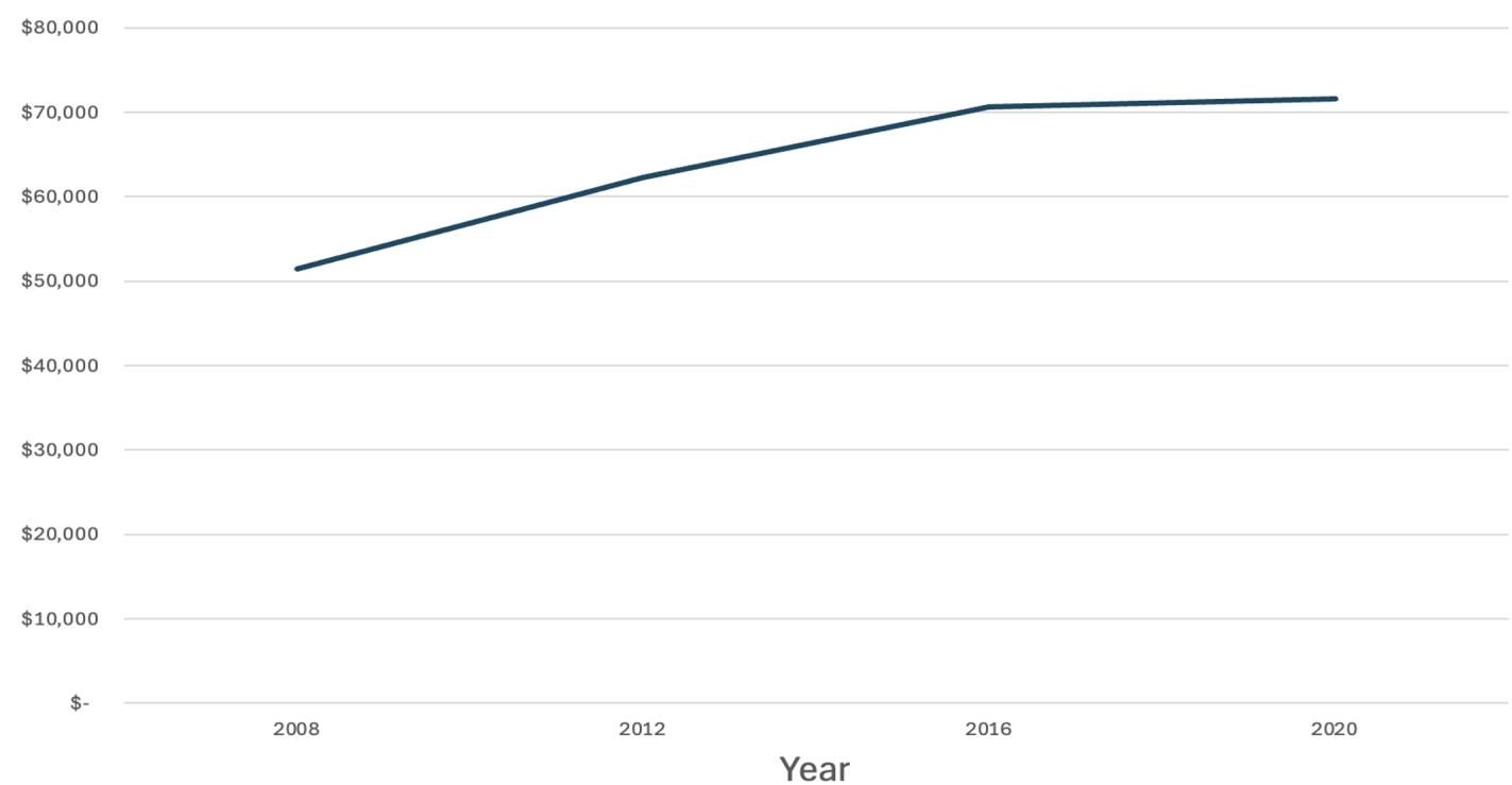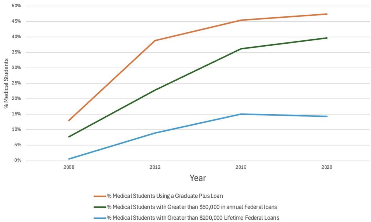 从图[2]中我们可以清晰地看到这种依赖程度的变化:使用“加号贷款”的学生比例从2008年的13%一路飙升到了2020年的47%,增幅高达262%。也就是说,接近一半的美国医学生都在靠这种“无限额”贷款来维持学业。