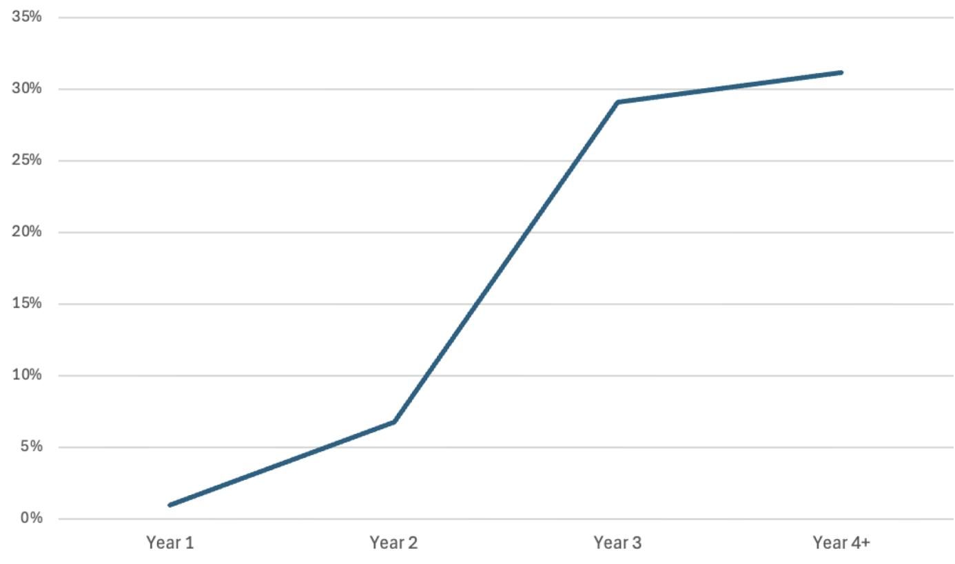 终身上限封顶:如图[3]所示,医学生的债务积累随着年级升高呈直线上升趋势。到了四年级及以上(Year 4+),有超过**30%**的学生背负的联邦债务已经突破了20万美元。这意味着,按照新政的“终身20万封顶”规定,每三个即将毕业的医学生中,就有一个会在毕业前夕面临“断供”的风险。