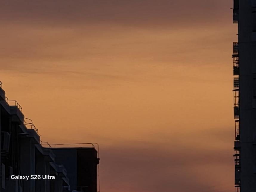 天空的橙粉渐变过渡自然,没有断层或噪点,建筑的暗部轮廓干净,展现了长焦镜头在弱光环境下的色彩控制能力。