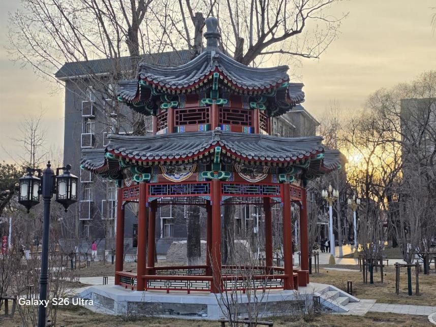 一如样张中,面对逆光环境,天空的暖黄渐变与亭台的暗部细节得到了良好保留,既没有让天空过曝发白,也没有让建筑细节丢失在阴影中,展现了旗舰级的 HDR 表现。2 亿像素主摄的高解析力优势尽显,亭台的木构榫卯、飞檐翘角、彩绘纹样都清晰可辨,边缘锐利无糊边;色彩还原真实自然,红柱青瓦的饱和度恰到好处,黄昏暖光与建筑冷色调形成柔和对比,没有出现过曝或偏色。