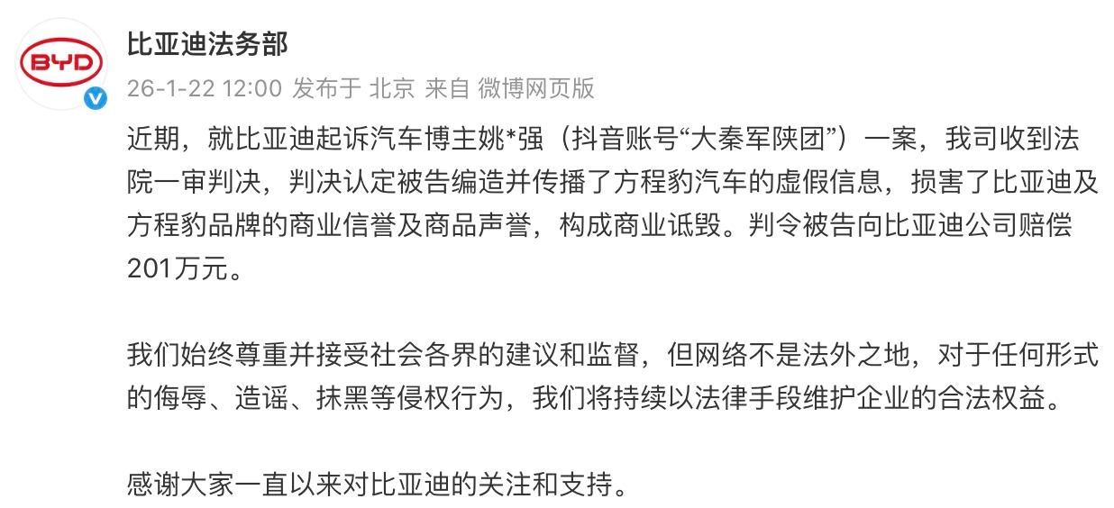 1月22日,比亚迪法务部的一则公告,让汽车圈再度聚焦“言论边界”这一核心议题。拥有140万粉丝的抖音汽车博主姚某强(账号“大秦军陕团”),因编造方程豹豹5车型“百公里油耗18升”的虚假信息,被法院一审判决构成商业诋毁,需向比亚迪赔偿201万元。这张沉甸甸的罚单,不仅是对造谣者的惩戒,更给喧嚣的车圈自媒体行业敲响了警钟。