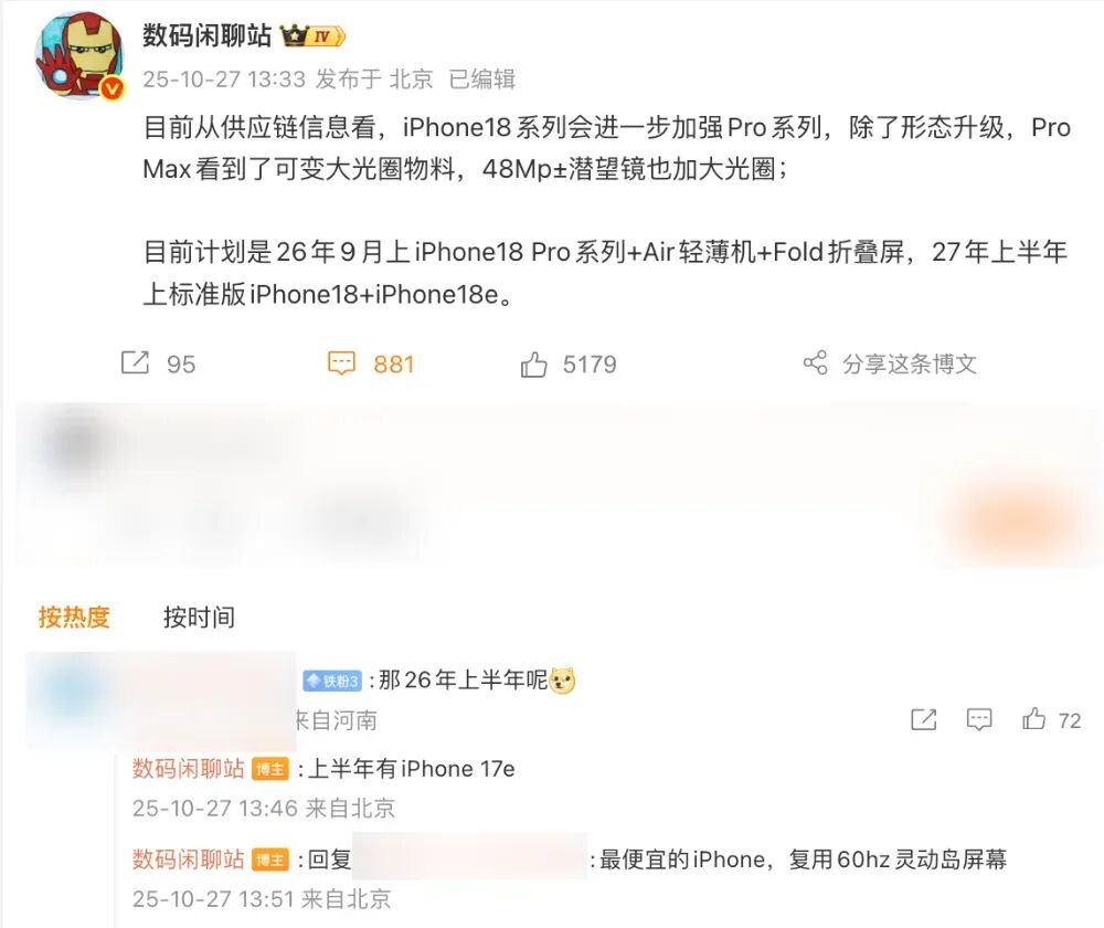 结合热搜内容来看,这是由于博主@数码闲聊站 表示目前从供应链信息看,iPhone18系列会进一步加强Pro系列,除了形态升级,Pro Max看到了可变大光圈物料,48Mp±潜望镜也加大光圈。