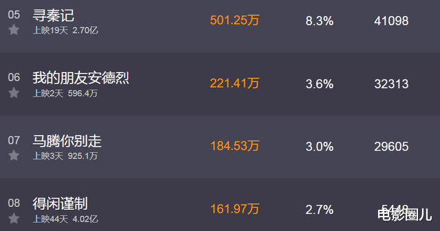 但很可惜的是,《我的朋友安德烈》上映首日票房仅375万,10.3%的排片仅仅拿下了4.1%的票房占比,上映第二天单日票房更是低至221万,7.6的排片仅有3.6%的票房占比,两天总票房仅596万,令人大跌眼镜,扑得太惨了!