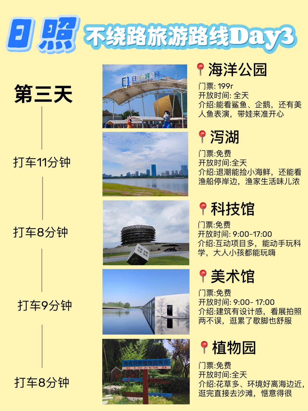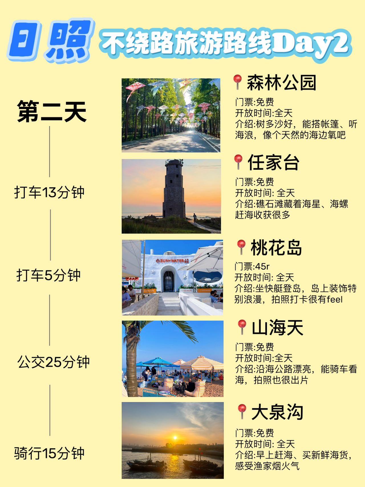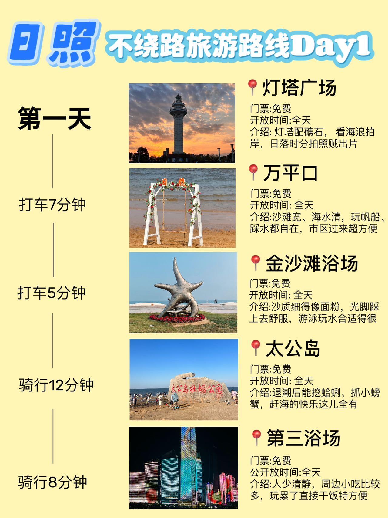 1️⃣万平口海滨风景区:日照的标志性景点,沙滩细腻,海水清澈,3号门有天空之镜、海边秋千等众多网红打卡点,拍照出片率高,还能体验海上漂流等水上项目。2️⃣灯塔风景区:日照的地标之一,是欣赏日出的绝佳地点,清晨可在此观看海上日出,灯塔与海浪构成浪漫画面,退潮时还能打卡爱心礁石。