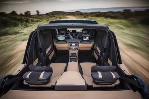 车身侧面是新车的核心变化所在,将基于燃油车型打造的它,采用四门布局设计,这一调整让敞篷版的实用性大幅提升。最引人注目的是,车辆C柱之后换为软顶敞篷材质,软顶采用多层防水帆布打造,支持电动开启与关闭,开启时间仅需15秒,在时速50公里以内均可操作,兼顾便捷性与安全性。19英寸越野轮毂搭配全地形轮胎,配合宽体轮眉与侧裙的镀铬饰条,硬派与优雅在此完美融合。车尾设计延续了G级的经典元素,竖向排列的LED尾灯与前脸大灯形成呼应,灯腔内采用三维立体光源,夜间点亮后极具识别度。软顶敞篷收起后会收纳于车尾备胎下方的专属空间,不会占用后备箱容积,保证了日常使用的实用性。