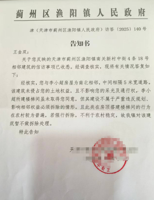 作为亲身经历者,我不得不对蓟州区渔阳镇有关部门发出质问:当合法翻建申请被拒,而无证违建却拔地而起;当三次信访换来复制粘贴的回复;当“不严重影响规划”成为违建的护身符——这究竟是政策执行偏差,还是对法治的公然藐视?