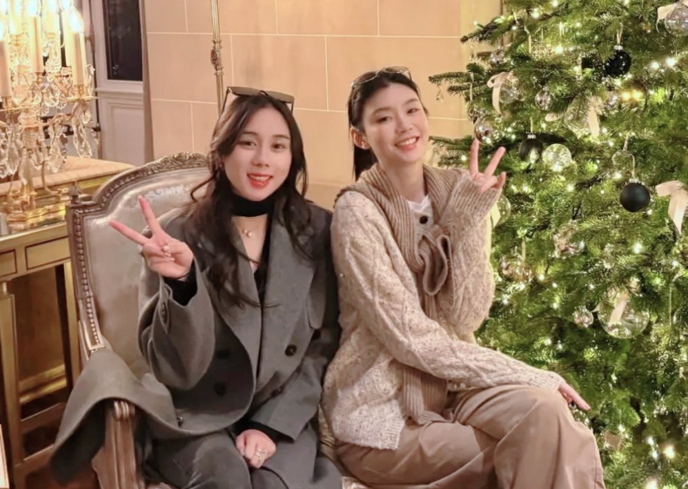回顾奚梦瑶与小姑子何超欣之前的合照,两人感情是真的好;比如她俩一起在圣诞树前拍照,一单手比V一个伸出手做出挥手的姿势。