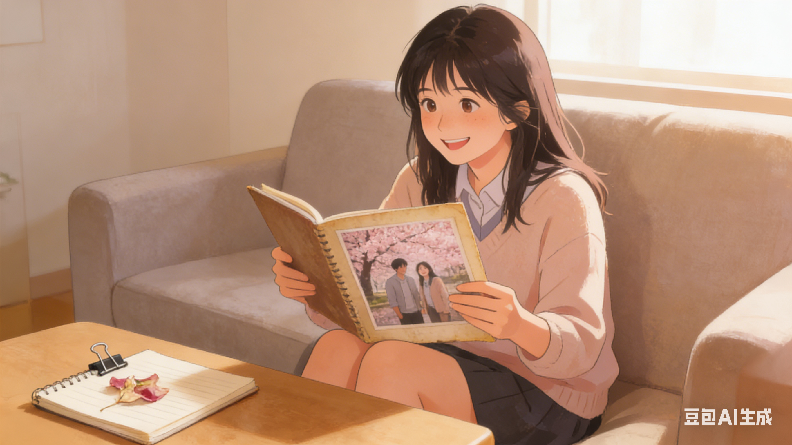 时光过得真快,一年又一年,日子就在平淡中慢慢往前走。我们搬了新家,抽屉里添了不少新本子,可那片樱花花瓣,还安安稳稳地躺在旧笔记本的那一页;楼下的老槐树早就不在了,但每到春天,你总会特意买些槐花糕回来,笑着递给我:“尝尝,还是春天的味道。”