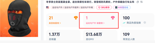 FastMoss数据显示,1月2日-1月8日期间,该款保暖面罩共卖出了1.22万件,销售总额达到12.25万美元(约合人民币85万元),成功登顶TikTok美区运动户外类目销量榜第一。至今现在,这款单品热度未减,依旧稳居类目销量前十,成为冬季跨境电商的热门选品。